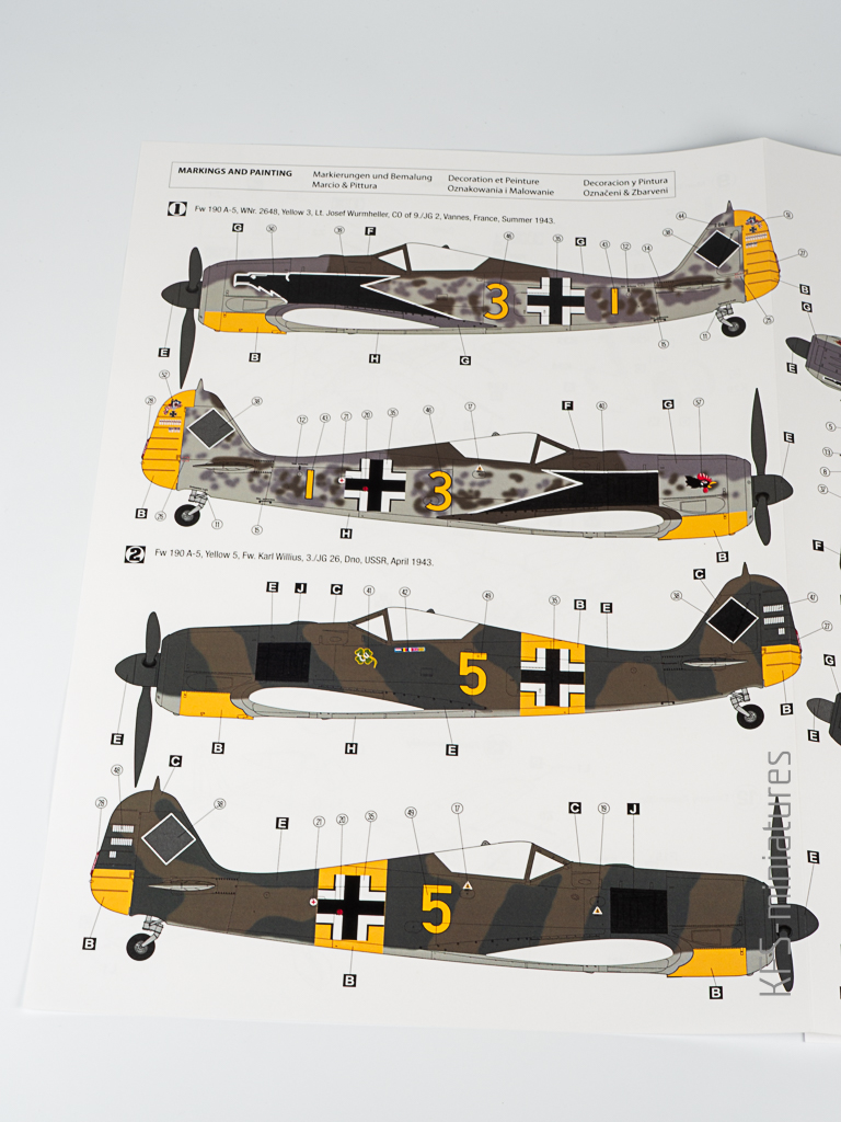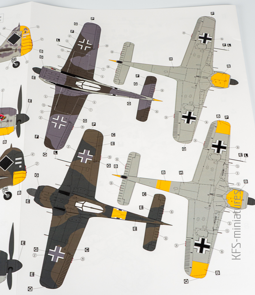 Hobby 2000 dorzuca trzy schematy malowania. Najciekawszy moim zdaniem jest ten z orłem na kadłubie. Z kolei szaro-buro-zielona propozycja z Frontu Wschodniego… Cóż, powiedzmy, że to gwałt na subtelnej urodzie Focke-Wulfa i przejdźmy dalej.