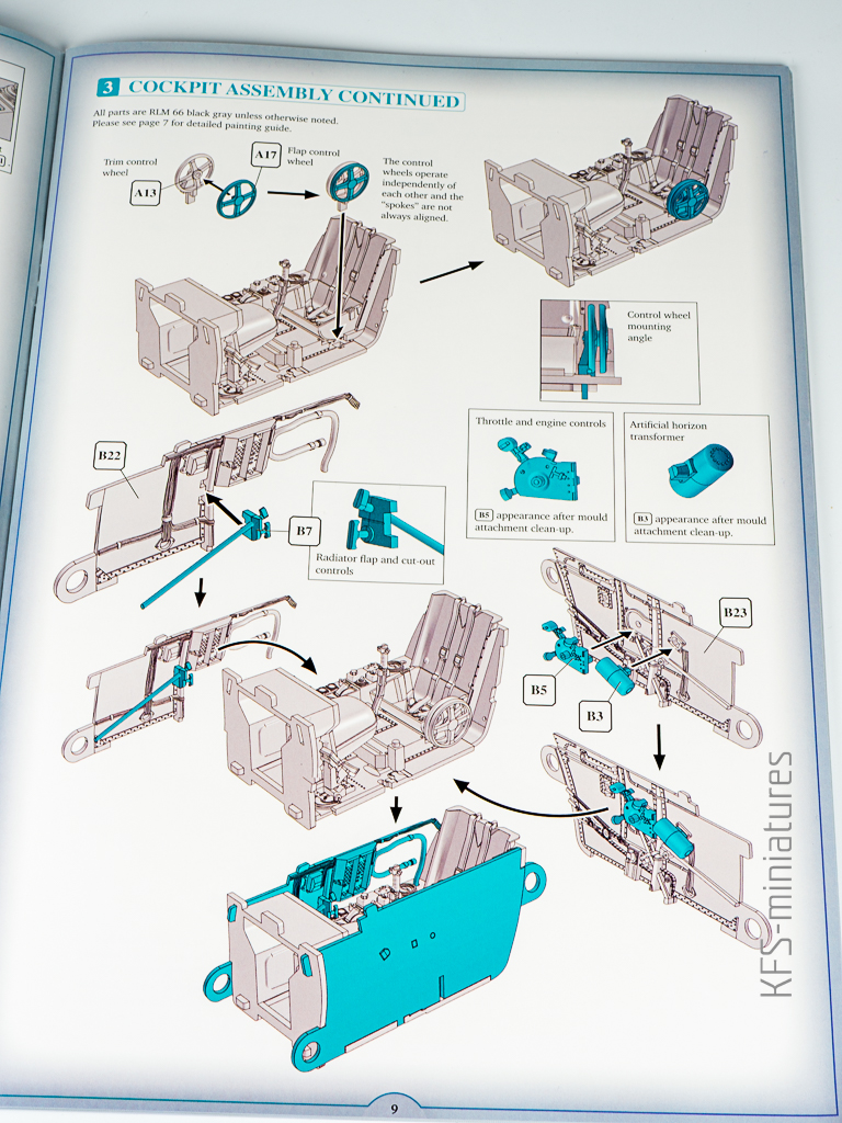 No dobra, ale poza fajnymi fotami z epoki, instrukcja to wciąż instrukcja. Klasycznie, zaczyna się od budowy kokpitu. A dokładnie tablicy przyrządów, którą producent wyposażył w pokaźna liczbę kalkomanii z imitacjami zegarów.