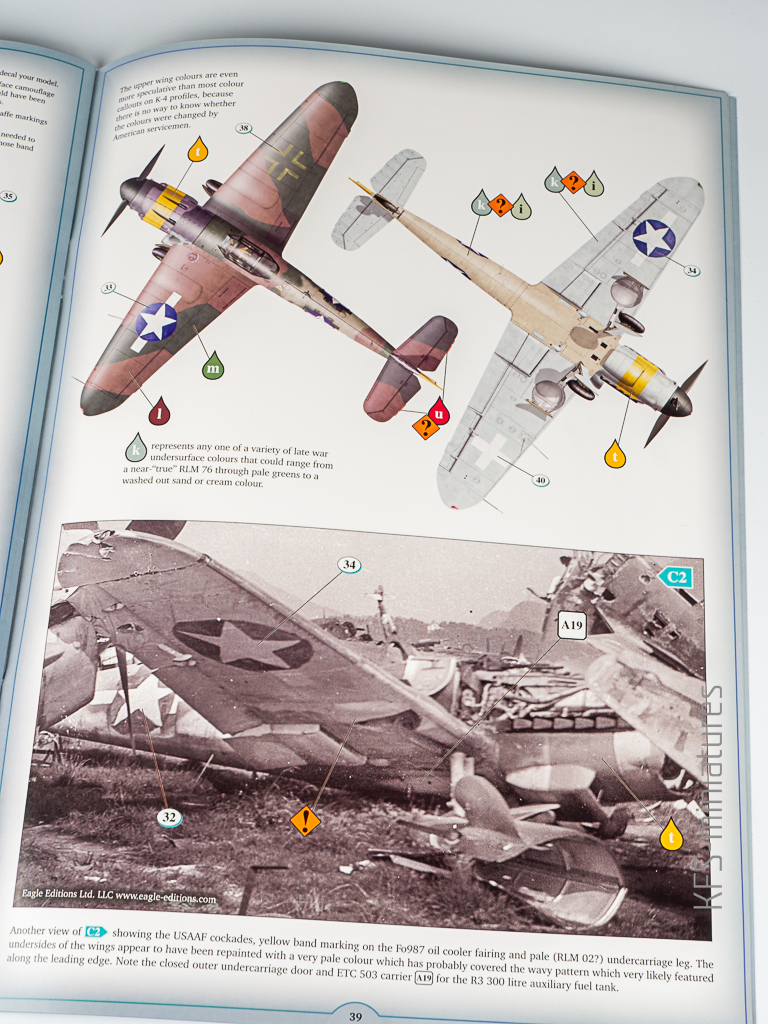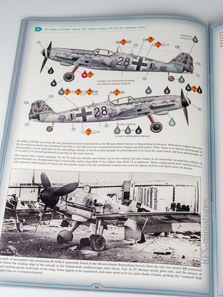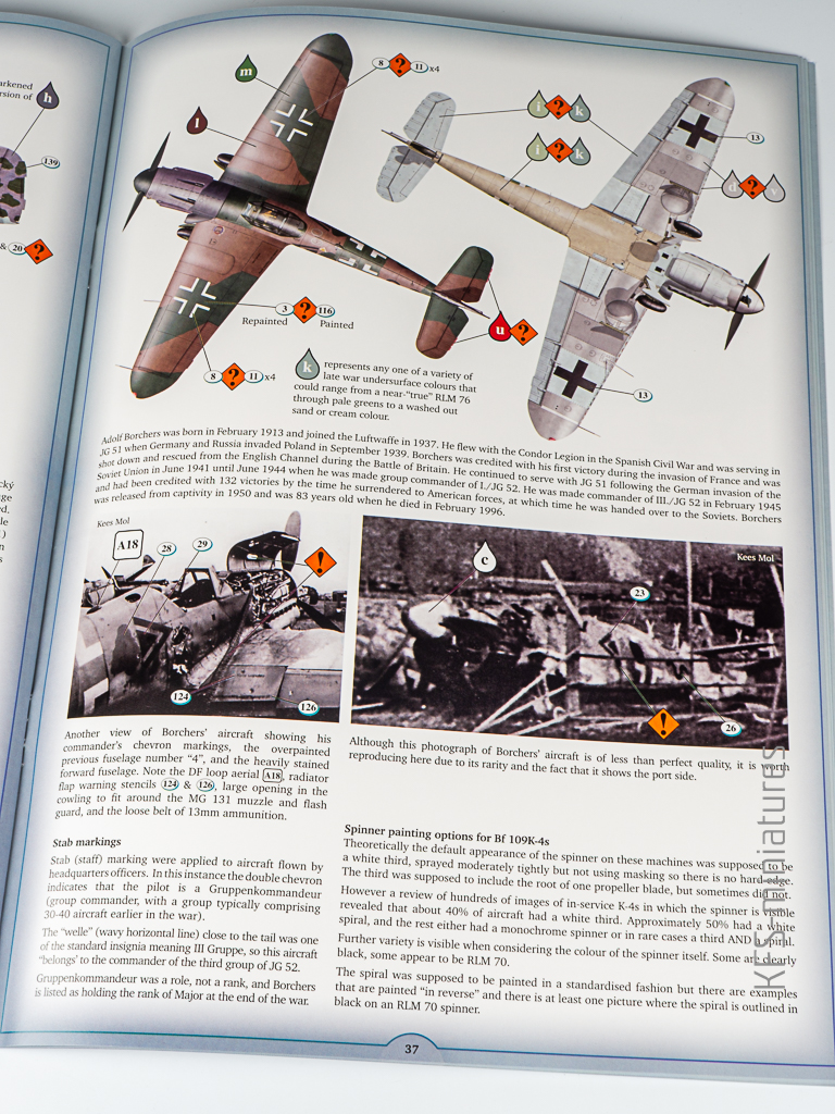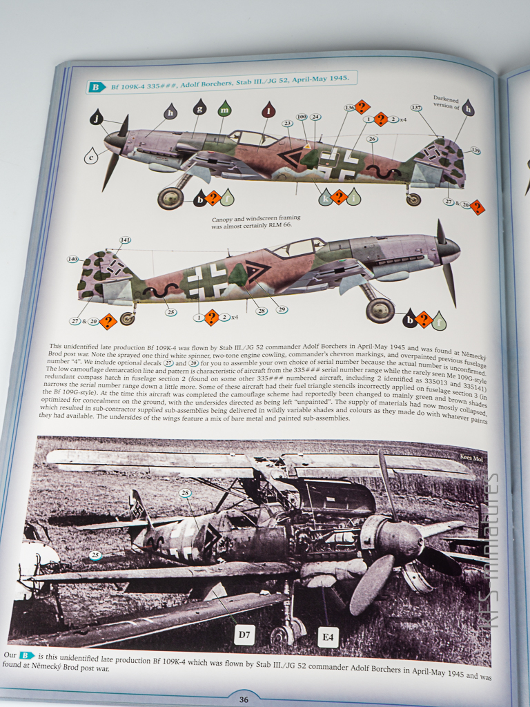 Na zakończenie warto wspomnieć, że instrukcja kończy się schematami propozycji malowania – i to nie byle jakich. Kotare przygotowało kilka atrakcyjnych wariantów, dobrze udokumentowanych i podanych w przejrzysty sposób. To przyjemne zwieńczenie całej lektury instrukcji i naturalne zamknięcie procesu budowy Bf 109K w tej skali. Z jednym zastrzeżeniem – Ronny Bar, autor tych rysunków, późno wojenne kolory RLM poznał chyba z przekazów ustnych. W efekcie RLM81 wygląda jak jakiś Brown- Earth. Jasne, to tylko kolorowanka, ale stawiam dukaty przeciwko orzechom, że znajdzie się niejeden współmodelarz ,który bedzie próbował mieszać humbrolki do uzyskania ” prawdziwego” koloru…