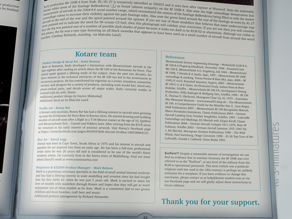 Kończąc naszą podróż przez 43 strony instrukcji, trafimy na dwie perełki. Pierwsza, to znana z instrukcji Wingnut Wings prezentacja osób stojących za tym co znajdziemy w pudełku. Oraz ostateczne rozwiązanie problemu “Kurfürsta”