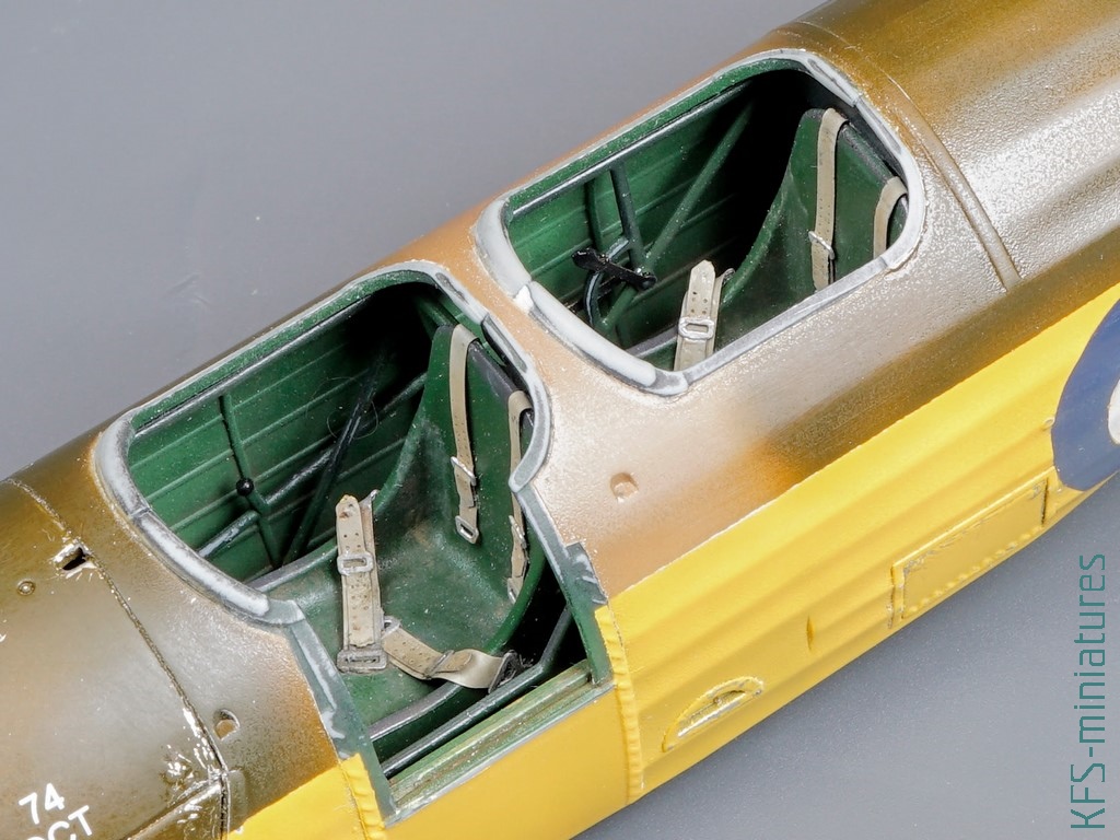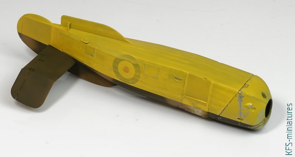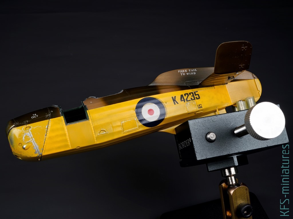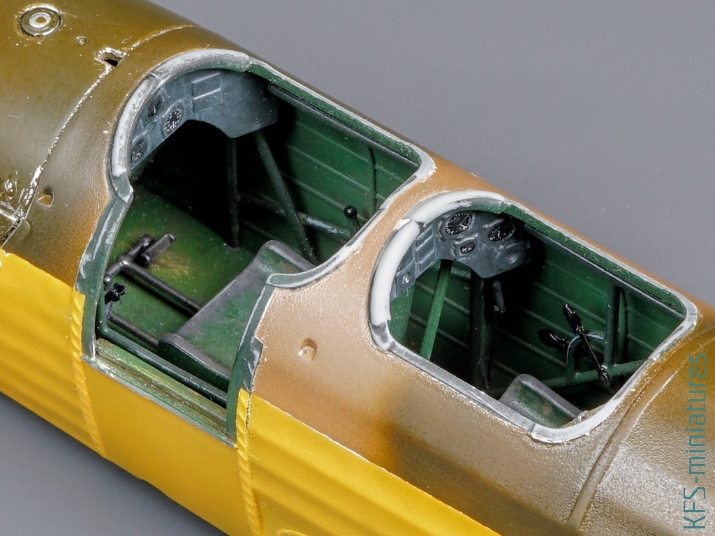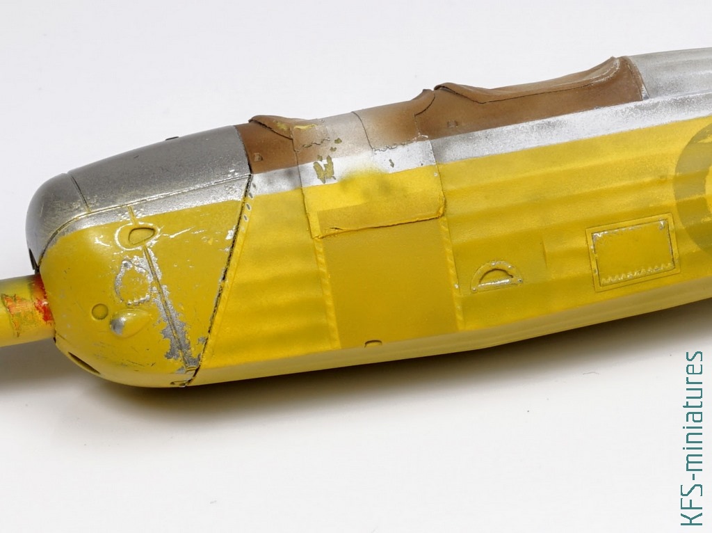 W tym temacie popełniłem dwa błędy przy tej budowie. Po pierwsze pomalowałem większość modelu żółtą farbą z palety Hataka Orange (o tym więcej w dalszej części tekstu), tylko nie wiem dokładnie którą, a że popełniłem błąd przy maskowaniu (zamaskowałem “framugę” drzwiczek pilota, która również powinna być żółta), to pasowałoby zrobić podmalówki. Żółte kolory mają to do siebie, że dosyć mocno się od siebie różnią, więc musiałbym teraz kupić kilka i próbować na boku, testując kolor.