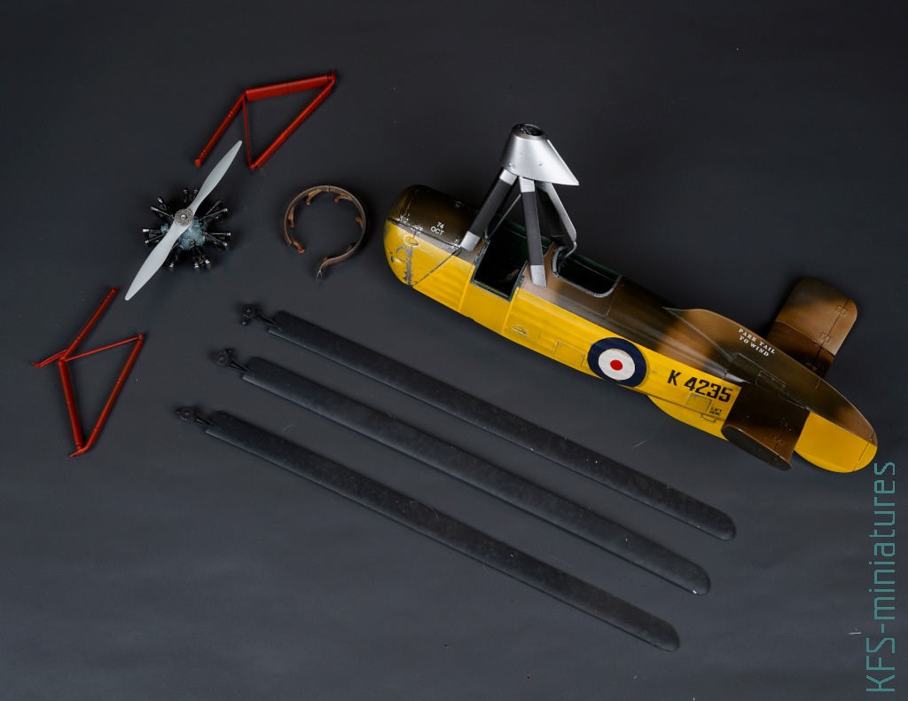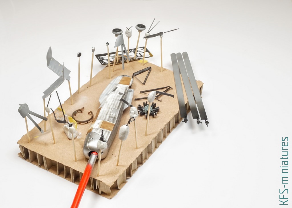 Jako, że dotarłem do tych materiałów dopiero po pomalowaniu prawie wszystkich elementów modelu, to bardzo ryzykowna byłaby aplikacja tych wszystkich anten i drucików na tym etapie. Wtedy właśnie, ostatecznie straciłem całkowicie serce do tego małego wiatrakowca, który od prawie 4 lat leży w pudełku w takim stanie: