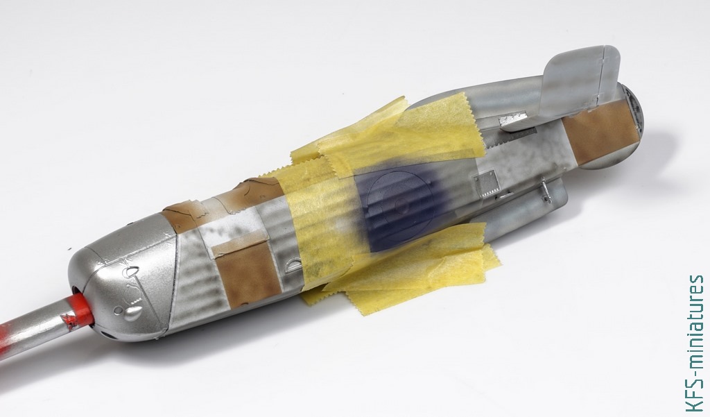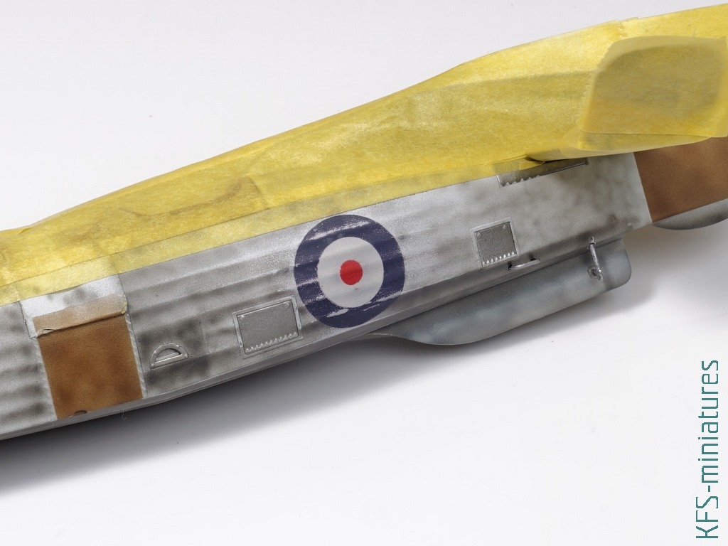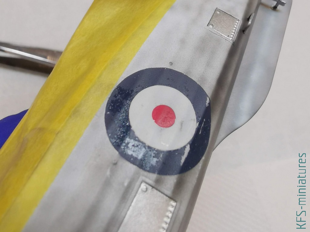 Rondle oczywiście musiałem przemalować, bo wyglądały żałośnie. Oczywiście nici już były z mojej koncepcji “zamalowanych”. Mogłem po prostu je przemalować, ale żeby przekuć tę porażkę w “sukces” uznałem, że… przesunę rondle w osi! Miało być, że niby ktoś, kto to serwisował wiatrakowiec nie wycentrował szablonu i tak akurat mu się zdarzyło… z obu stron. Prawdopodobieństwo, że tak mogło być oceniam teraz na niemal zerowe. Zresztą spójrzcie jak żałośnie to wygląda: