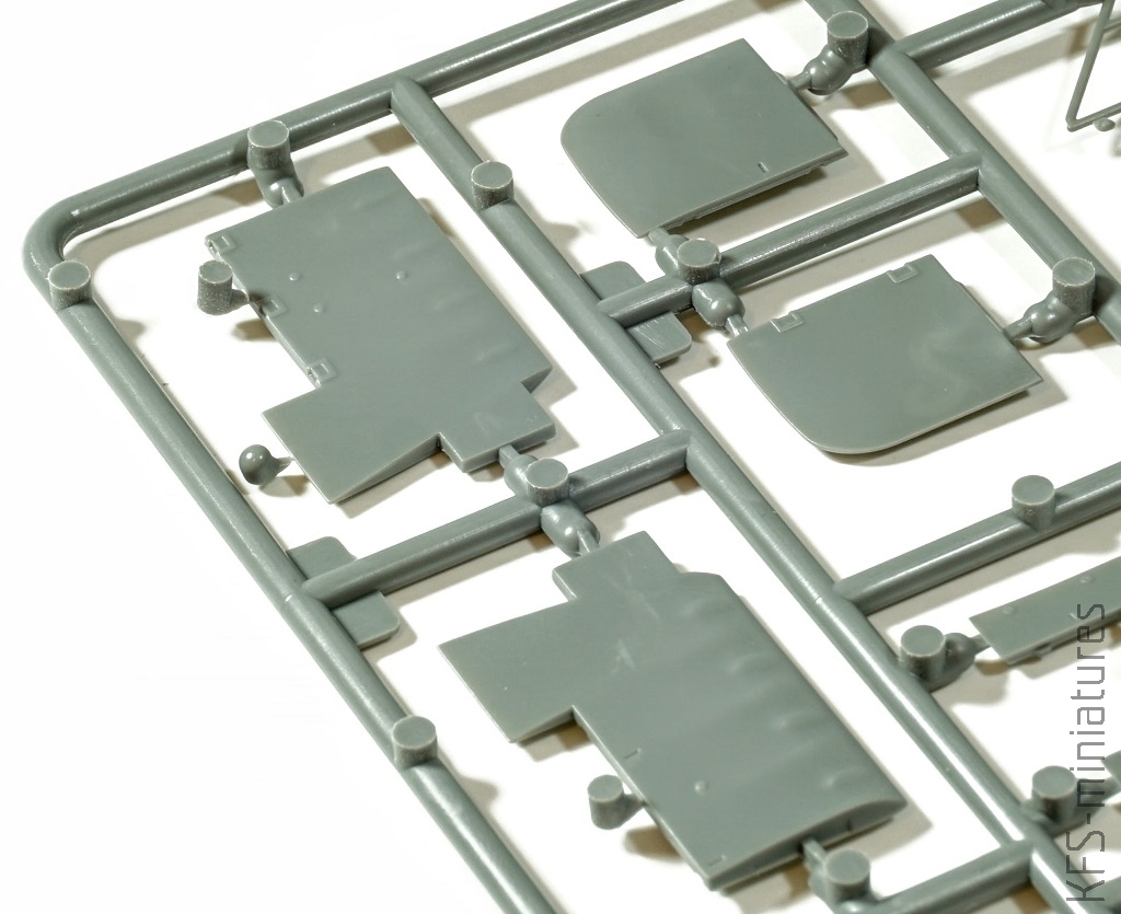 Blaszka nie jest przesadnie duża, ale znajduje się na niej sporo elementów. Mamy tutaj dwa komplety pasów, piasty śmigła, blaszki do silnika i wirników, parę dźwigienek oraz kilka innych elementów kadłuba.