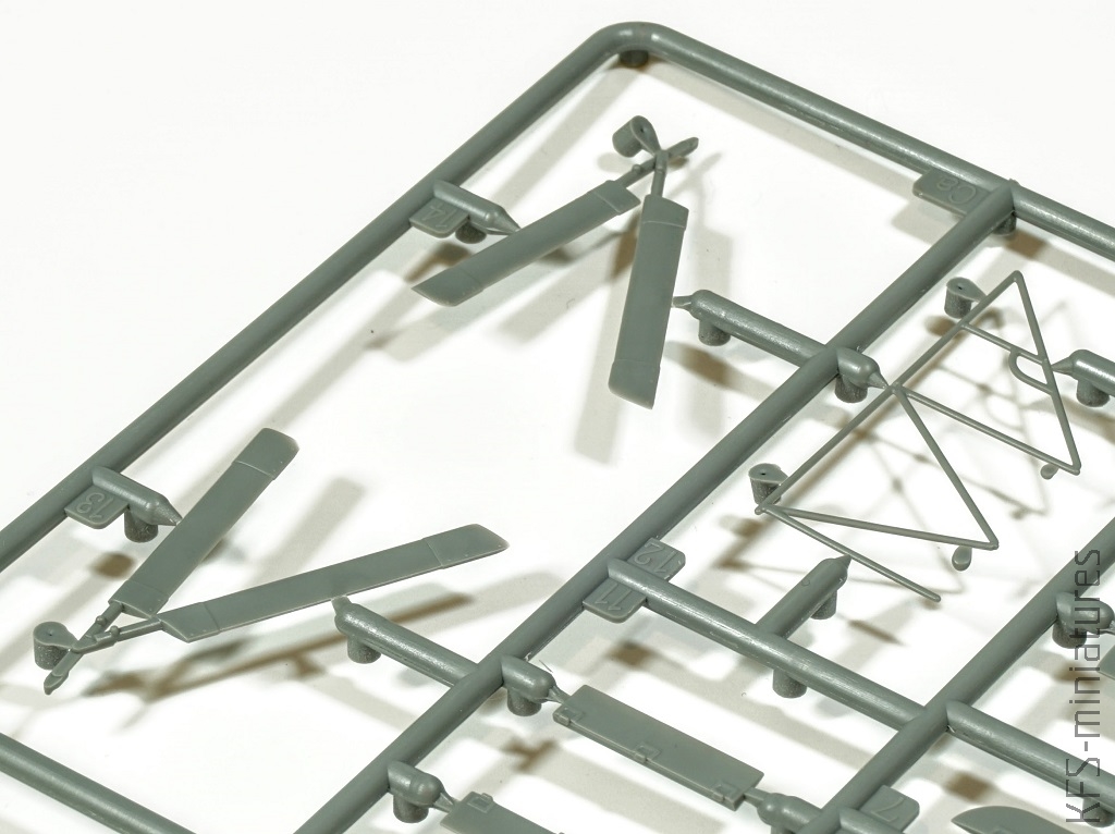 Poza tym w pudełku znajduje się 9 wyprasek, z czego jedna jest x3 (po jednym śmigle na każdą), oraz jedna – przezroczysta – zawiera owiewki pilota i nawigatora/ instruktora (czy kim tam był ten z tyłu).