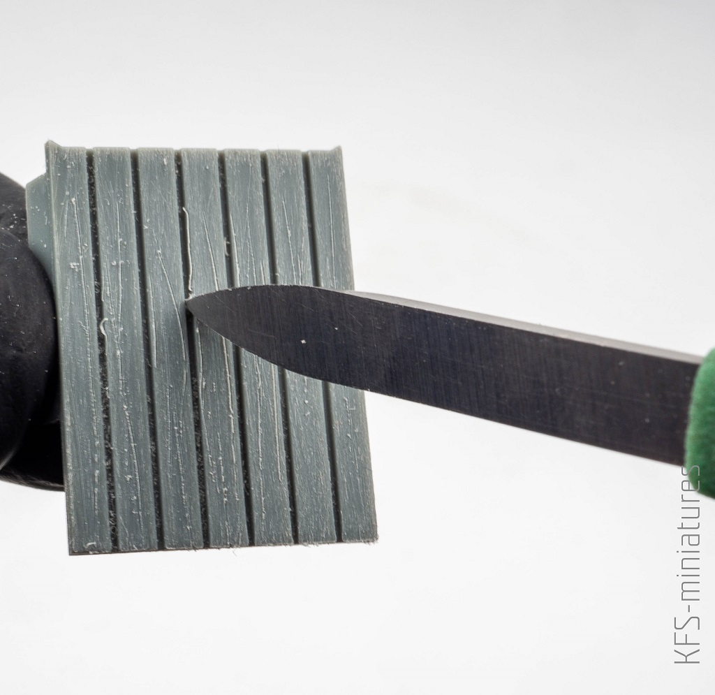 Drewniana podłoga na tyle samochodu nie została przyklejona – chciałem zaprezentować ją drewnianą, niemalowaną. Dlatego to od niej zaczynam proces malowania. Pierwszym krokiem było odtworzenie faktury drewna skrobakiem Trumpetera