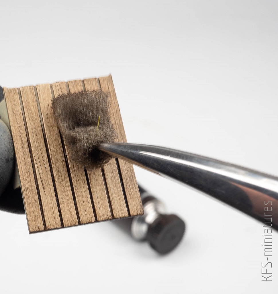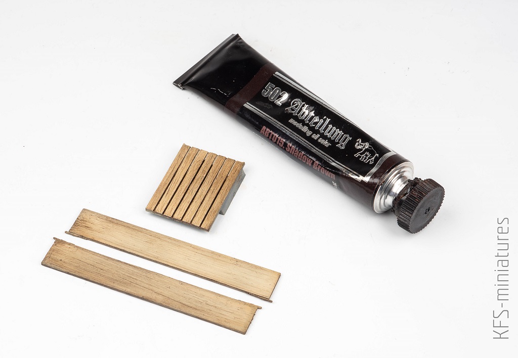 Przy użyciu gąbki namalowałem fakturę drewna olejną farbą ABT015 Shadow Brown z Abteilung 502. Zrobiłem to w podobny sposób jak Filip w jego materiale na temat malowania drewna, z tą różnica, że nie użyłem werniksu pomarańczowo-żółtego.