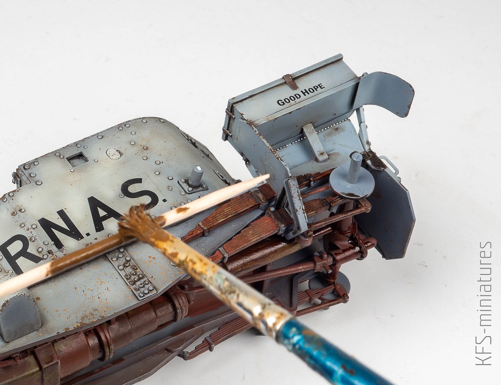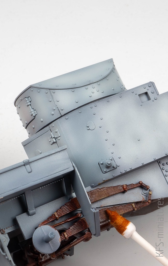 Rdzę na elementach podwozia namalowałem specyfikiem Dark Rust recenzowanym na tym portalu. Nakładałem mocno rozcieńczony płyn patyczkiem i rolowałem nim po każdym widocznym elemencie.