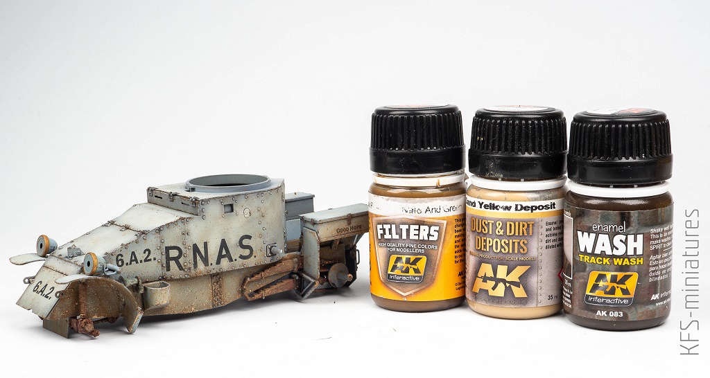 W kolejnych etapach dodałem plamki i rozpryski przy użyciu siuwaksa AK076 Filter Dark Brown for NATO vehicles (bardzo mocno rozcieńczona farba idealnie nadaje się do wykonania splashy).