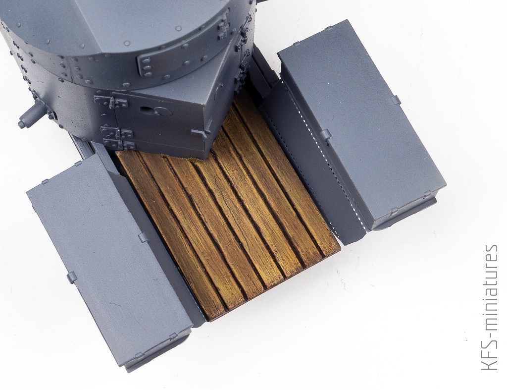 Ostatnim etapem weatheringu było odtworzenie rys i ubytków farby na otwieranych włazach i pokrywie silnika.