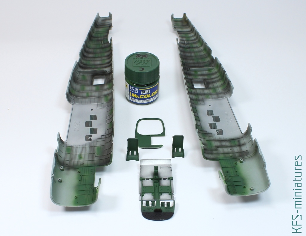 Kolejny kolor, użyty do malowania części we wnętrzu kadłuba, to zielony FS 34 092 – użyłem do tego farbę Mr.Color C302. Również wykorzystałem ten kolor do namalowania kilku plamek wewnątrz kadłuba, który miał być pokryty dużo jaśniejszym kolorem, więc ładnie mi to posłużyło jako element cieniowania.