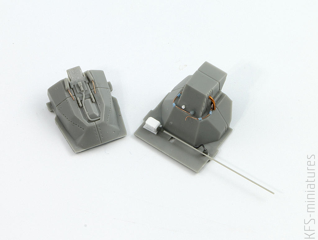 W moich składziku mam sporą ilość przeróżnych dodatków do modeli F-16. Czas było je wykorzystać. Zdecydowałem się na zamianę zestawowych czujników, na żywiczne zamienniki PK Productions. Różnica jest zasadnicza, co chyba widać na zdjęciu. Sensory Kinetica są po prostu toporne, żywiczne odpowiedniki wykonano ze znacznie większą finezją.