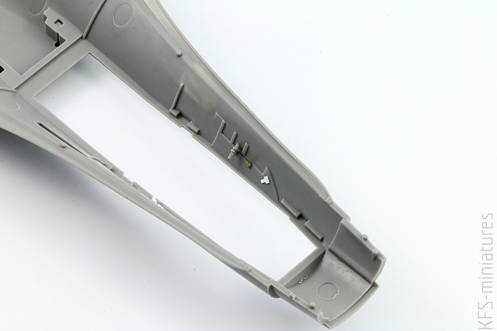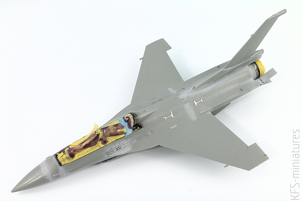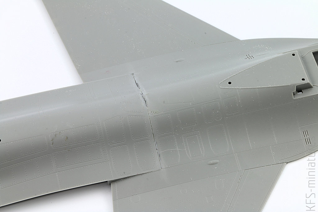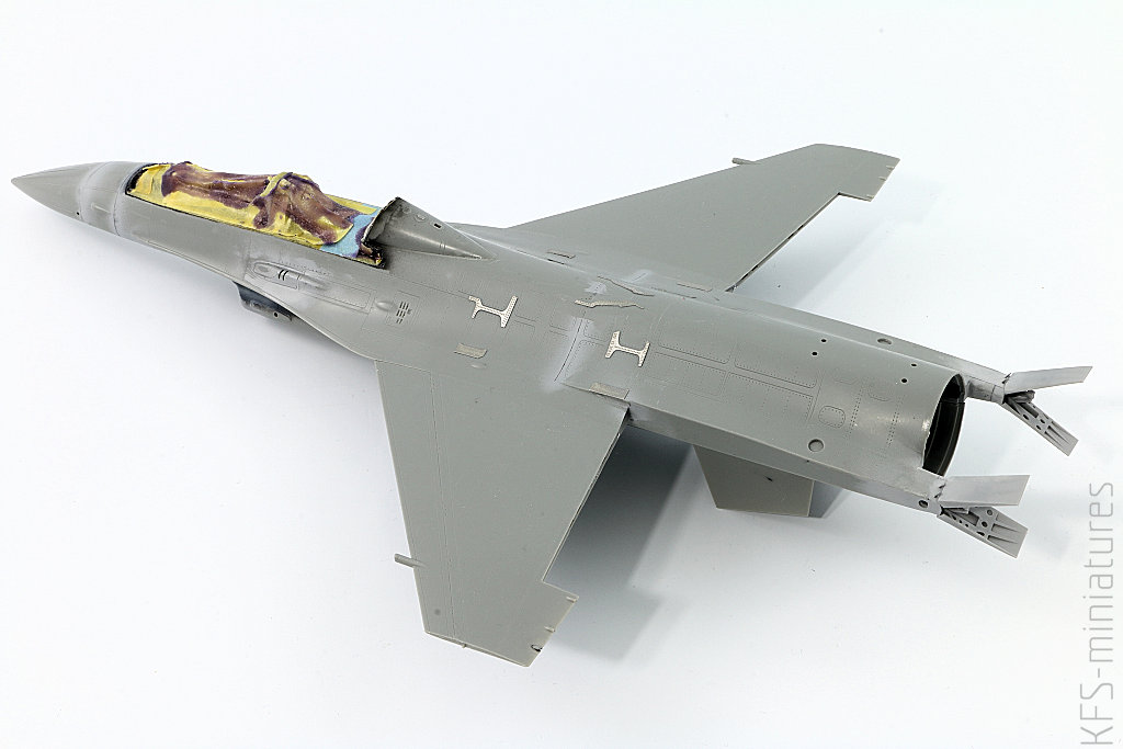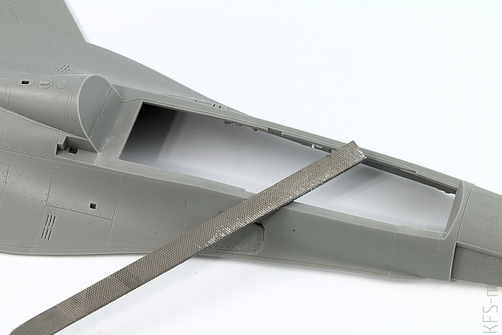 Podobnie jak w przypadku F-16 Tamiya, model Kinetica ma dość niewygodny do usunięcia problem ze spasowaniem krawędzi natarcia w okolicach kabiny. Po prostu dolna część kadłuba niekoniecznie wchodzi w górną, przez co powstaje dość wyraźny uskok między obiema krawędziami. Jedynym rozwiązaniem było mocno zebrać plastik z dolnej części kadłuba.