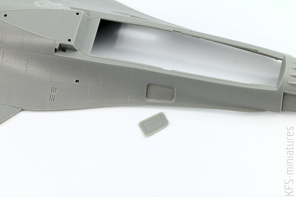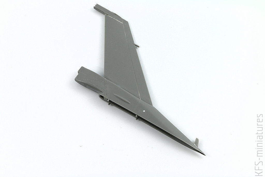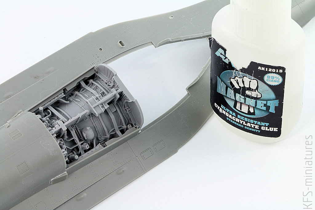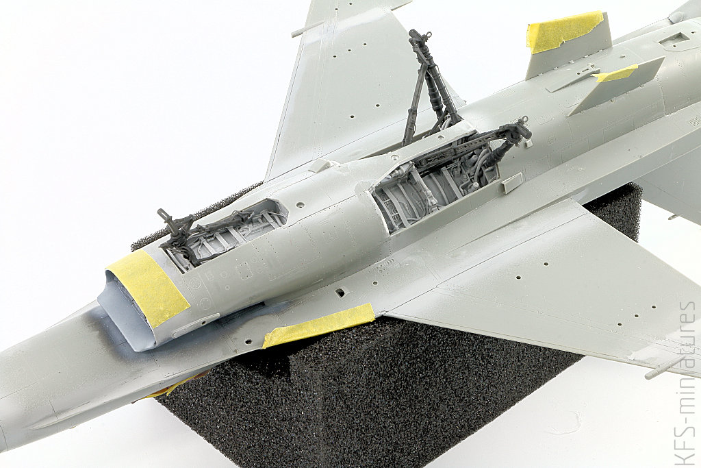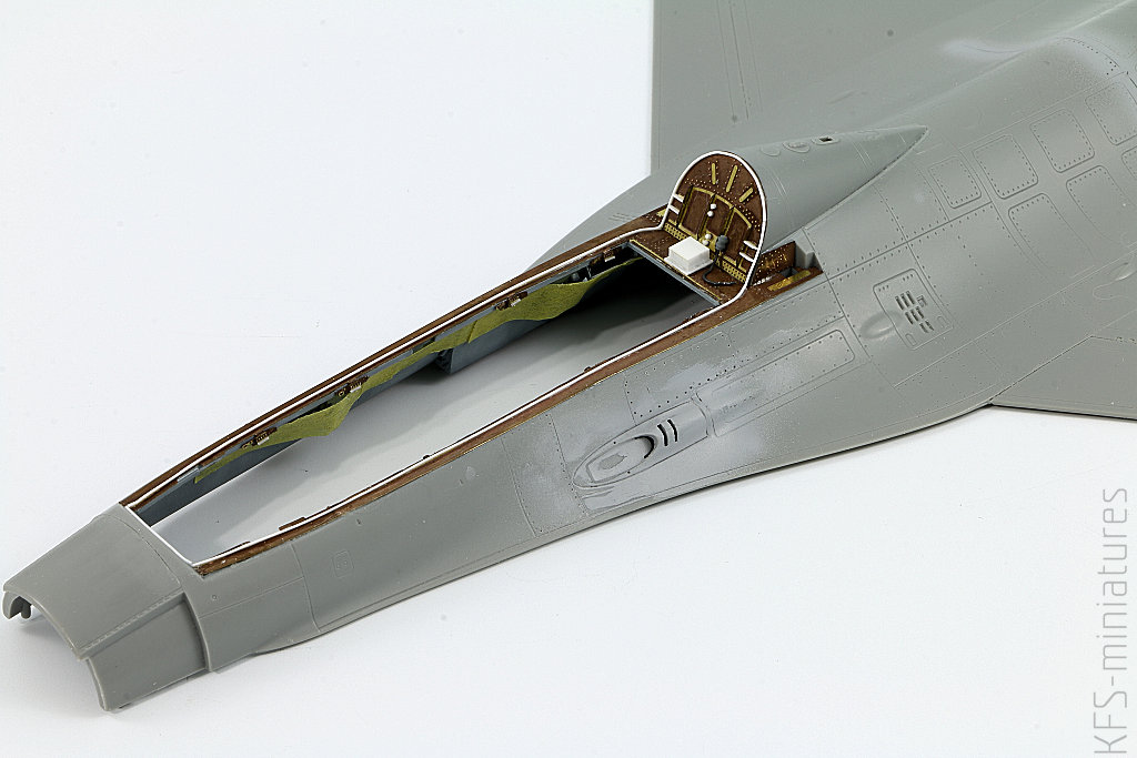 Podobnie jak w przypadku F-16 Tamiya, model Kinetica ma dość niewygodny do usunięcia problem ze spasowaniem krawędzi natarcia w okolicach kabiny. Po prostu dolna część kadłuba niekoniecznie wchodzi w górną, przez co powstaje dość wyraźny uskok między obiema krawędziami. Jedynym rozwiązaniem było mocno zebrać plastik z dolnej części kadłuba.