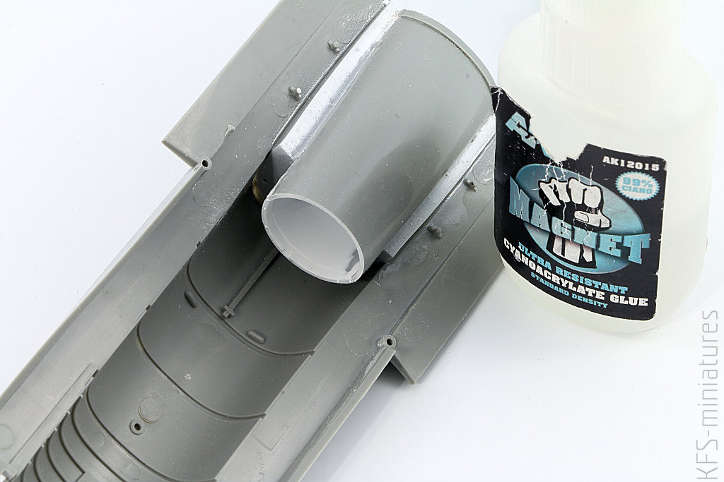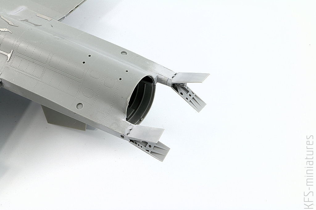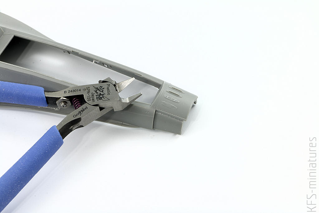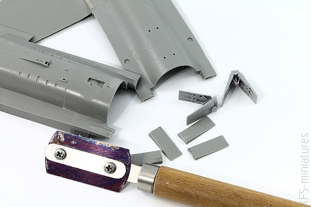Zestaw Kinetica, choć jak do tej pory było widać – znakomicie spasowany i ładnie wyglądający na ramkach, wymaga nieustannych korekt i modyfikacji. Na szczęście drobnych. Podstawa statecznika w mojej maszynie nie posiada dwóch małych elementów: wylotu i wlotu powietrza i trzeba było się tym zająć.