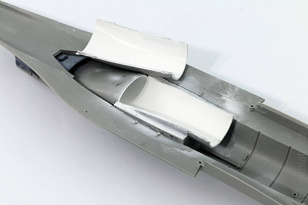 Wspominałem o poważnym błędzie. Zamiast skleić górną i dolną połówkę kanału dolotowego, które następnie trzeba skleić razem, ja zrobiłem – co widać na zdjęciach – zupełnie inaczej. Skutkiem tego nie miałem szansy zaszpachlować i dobrze wyszlifować miejsca łączenia przedniej i tylnej połówki rzeczonego kanału. Trzeba jednak było sobie jakoś radzić. Udało mi się w miarę bezboleśnie oderwać górę tylnej części, dzięki czemu mogłem wygodnie zaszpachlować łączenie w środku kanału, a następnie – po przyklejeniu górnego elementu – zaszpachlowałem i wyszlifowałem tył całej rury. Nie było to łatwe, bo kanał był już wklejony do kadłuba. Ale jakoś się udało. Na przyszłość będę pamiętać: najpierw sklejam połówki dołu i potem góry, a dopiero potem jedno z drugim.