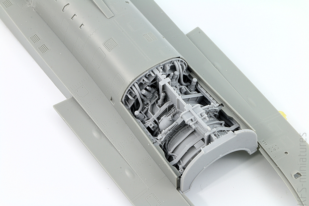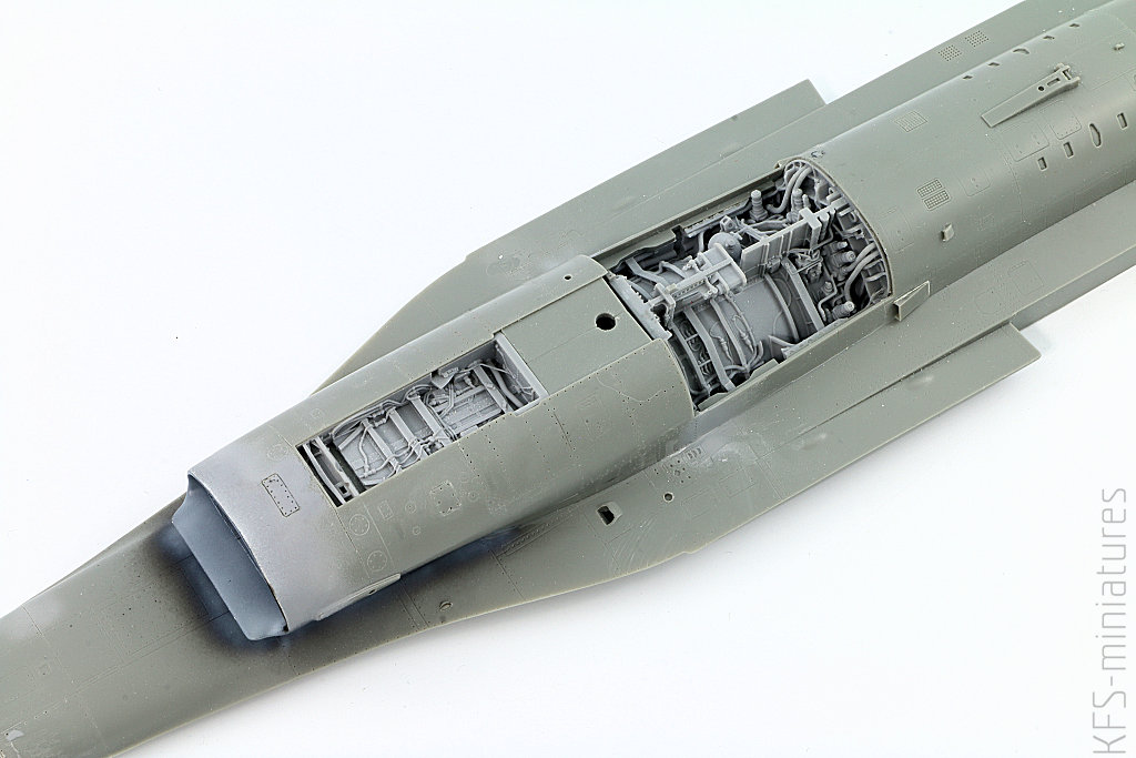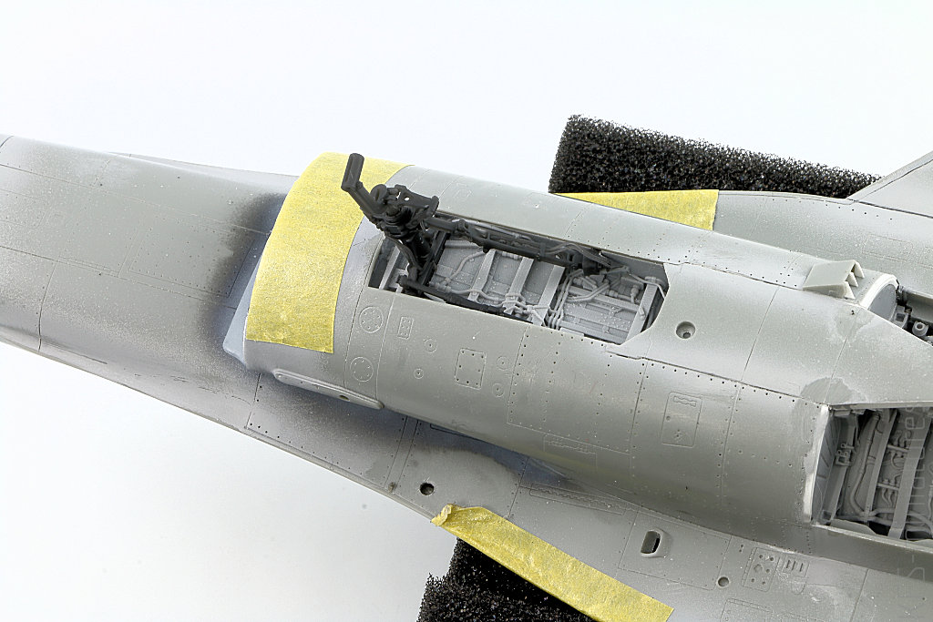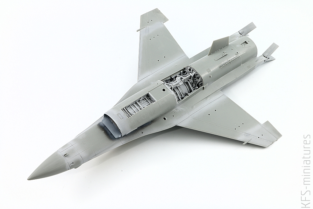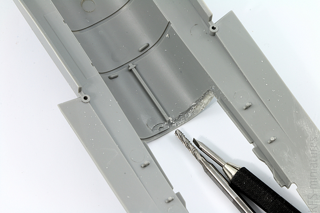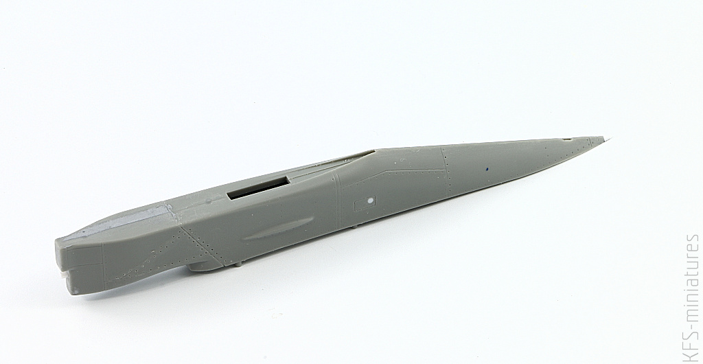 Wersja mojej maszyny nie posiada anten IFF, tzw. bird slicerów. Trzeba to było usunąć i zostawić poszycie kadłuba w tym miejscu gładkie.