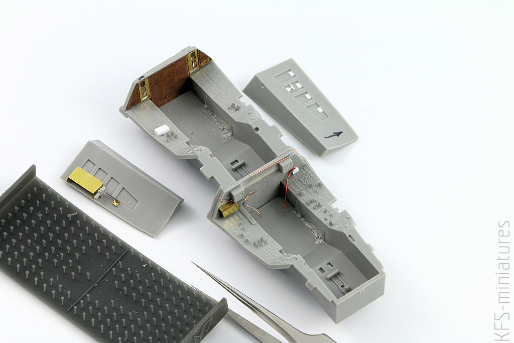 Wanna pilotów w wykonaniu Kinetica jest naprawdę ładna i szczegółowa, mimo że nie wolna od merytorycznych błędów. A ja od dłuższego już czasu czekałem na okazję do wykorzystania żywicznych przełączników do paneli, produkowanych przez Anyza. Tam gdzie się dało, takie pokrętła i przełączniki wkleiłem, nawiercając pod nie niewielkie otwory wiertłem 0,3 mm. Przykleiłem także tylne ścianki obu kabin. Na burtach kokpitu odtworzyłem kilka detali, dość wyraźnie widocznych w prawdziwym samolocie.