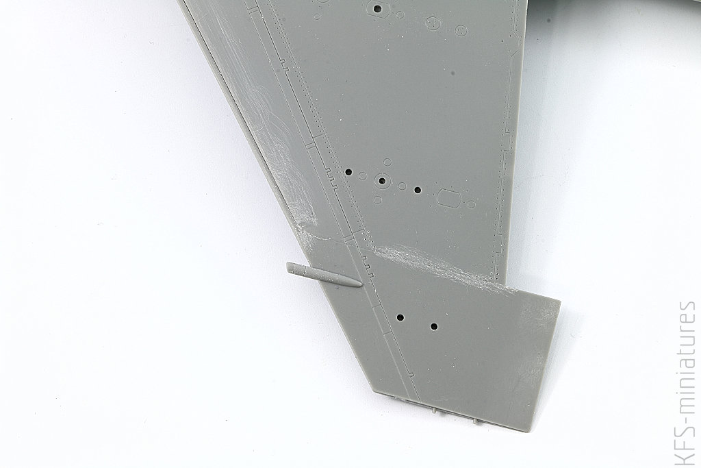 Na koniec wszystko skleiłem do kupy, przy okazji uzupełniając szczyt statecznika o anteny RWR wycięte z polistyrenu. Zestawowe nie wyglądały zbyt ciekawie.