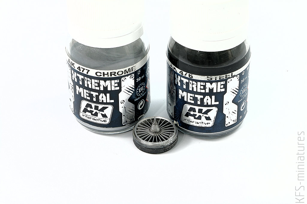 Jako że ta część jest w gotowym modelu widoczna jedynie z przodu i niemal zupełnie nie widać jej w ciemnościach, pomalowałem ją maksymalnie kontrastowymi metalizerami, nie bawiąc się w próby odtworzenia efektów intensywnej pracy jaką wykonuje w myśliwcu ten element. Bo i tak tego kompletnie widać.