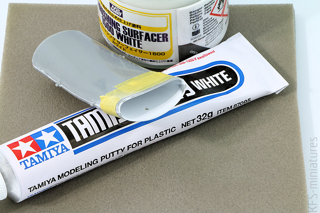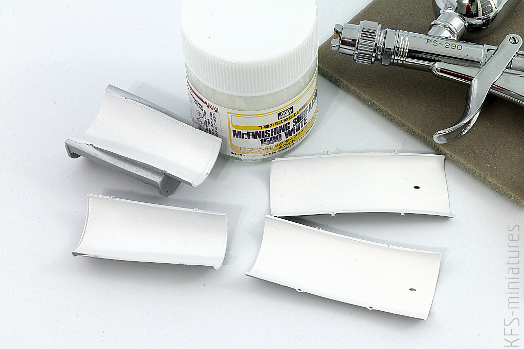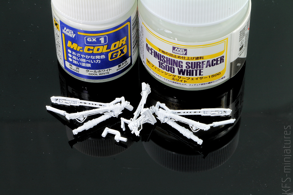 Zacząłem od malowania białym Surfacerem Gunze. Położyłem dwie warstwy podkładu, na koniec wszystko dokładnie szlifując najdrobniejszą gąbką ścierną jaką miałem. Nie chciałem żadnych przypadkowych pyłków przyklejonych do mokrego podkładu.
