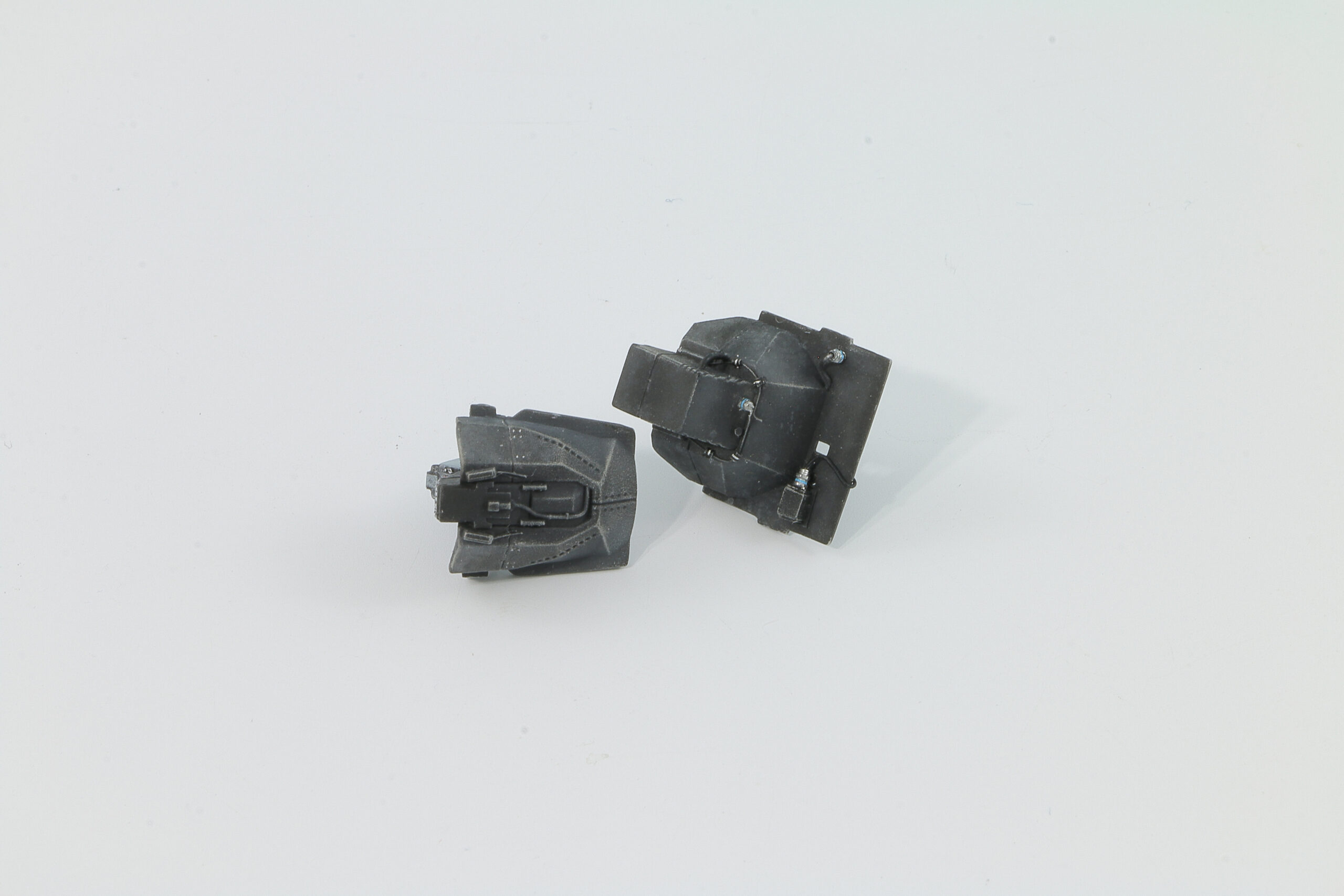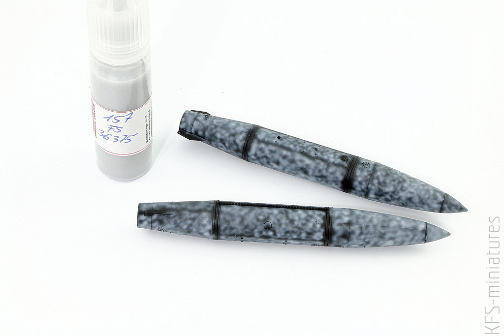 Tak przygotowane osłony pomalowałem różnymi odcieniami czerni i szarości. Całość dość mocno wzbogaciłem imitacjami zabrudzeń, jakie są często widoczne na tych elementach myśliwców. Pełno tam jasnoszarych plam i plamek, będących efektem kumulacji brudu wszelkiej maści.
