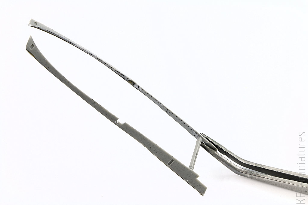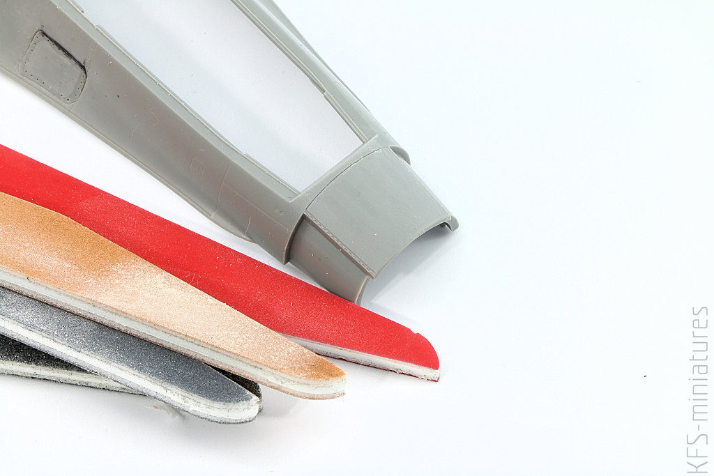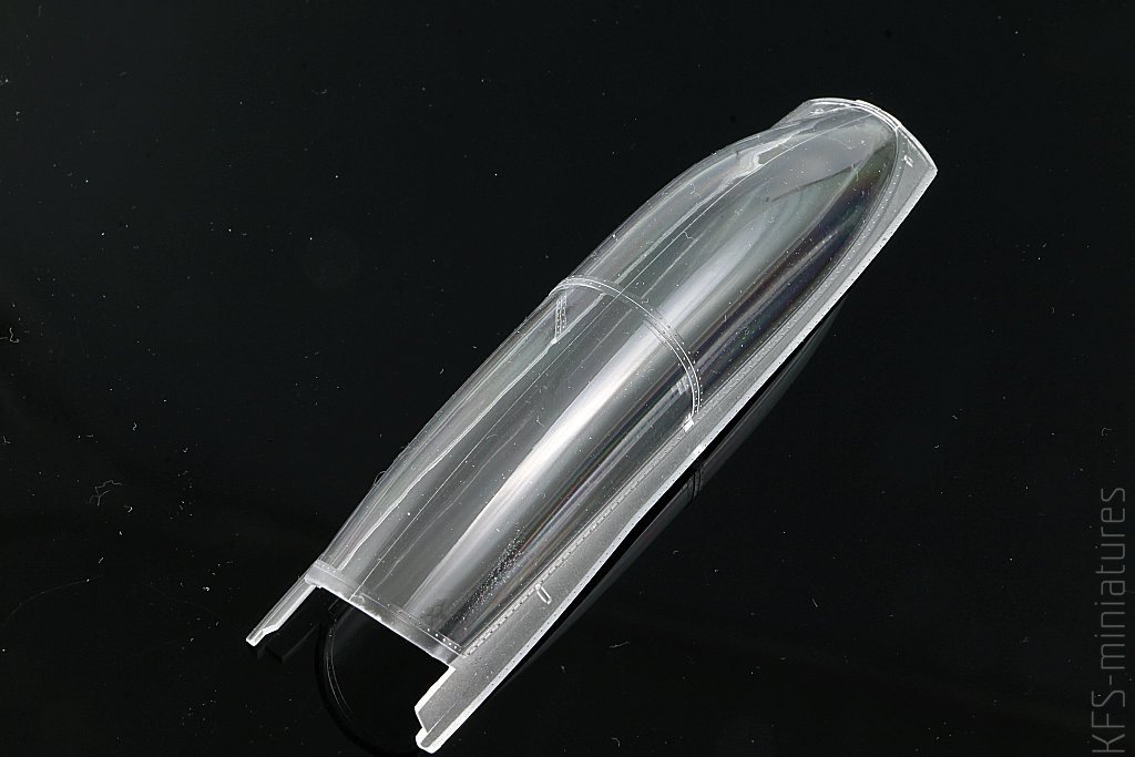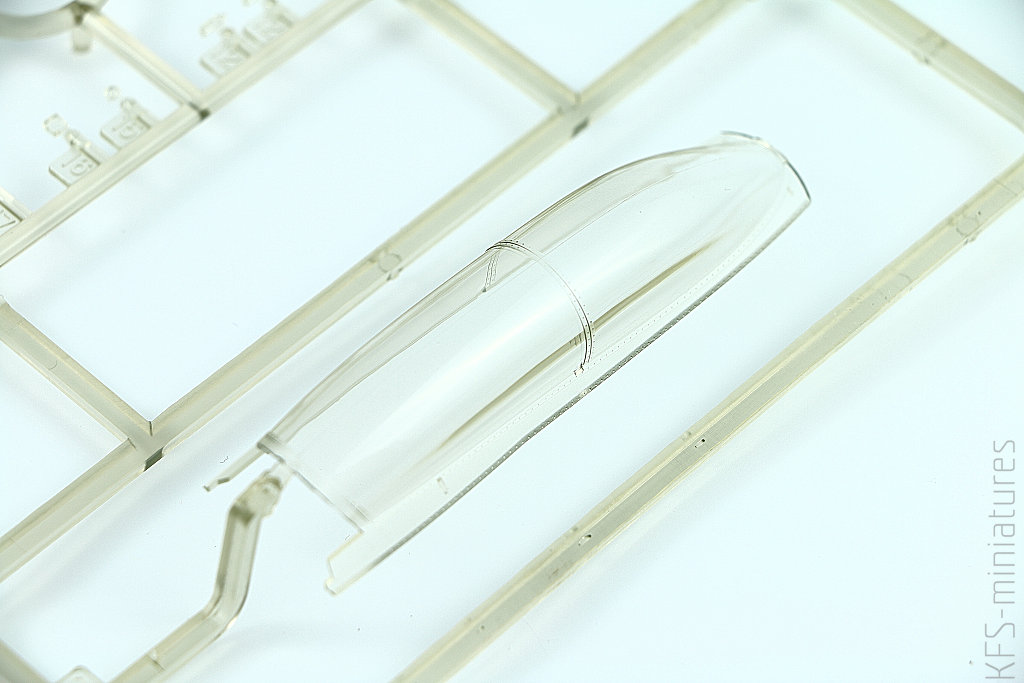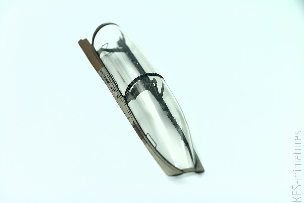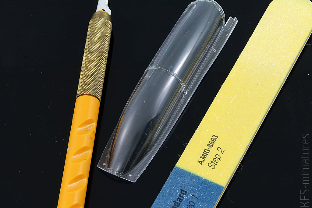 Kinetic postarał się i zrobił całkiem ładne, przejrzyste i dość cienkie szkło, ale szew zmusił mnie do dość mozolnego szlifowania i polerowania tego elementu. Jak zawsze, zacząłem od bardzo delikatnego zeskrobania szwu ostrzem skalpela. Potem użyłem bardzo wygodnego, jakby stworzonego do polerowania szklanych elementów pilnika Jimeneza, zbudowanego z 4 gradacji powierzchni ściernych. Na koniec skorzystałem z dwóch najdrobniejszych past Tamiya, w celu finalnej polerki.