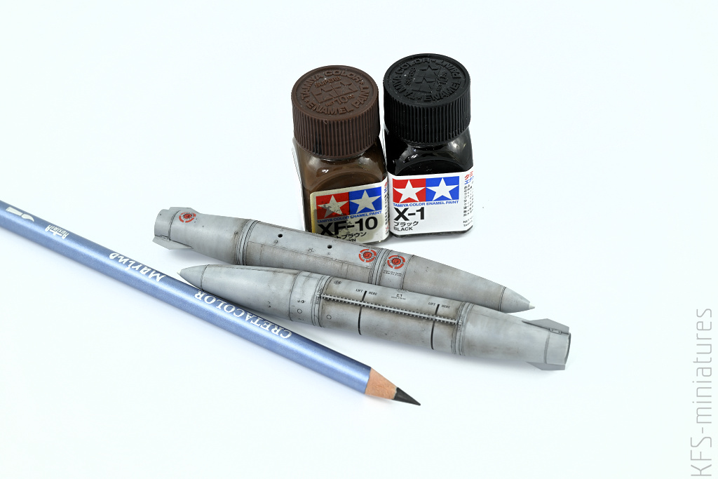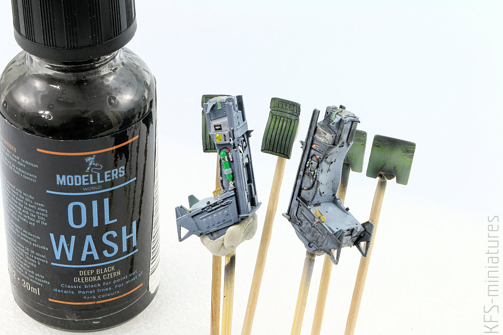 Po pomalowaniu detali i nałożeniu kalkomanii, całość zwashowałem i odrobinę pobrudziłem, wykorzystując farby olejne Tamiya, oraz czarną kredkę Cretacolor.