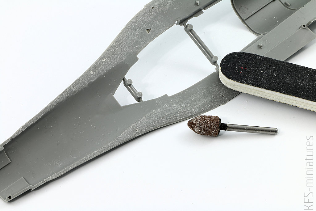 Samo wklejenie wspomnianych części skrzydeł nie stanowi już większego kłopotu, trzeba jednak je solidnie podszlifować pilnikiem od spodu, aby uniknąć kłopotów z zejściem się obu powierzchni bez żadnego uskoku. Mimo tego drobne szlifowanie i odtwarzanie detali wokół miejsc łączenia było jednak później potrzebne.