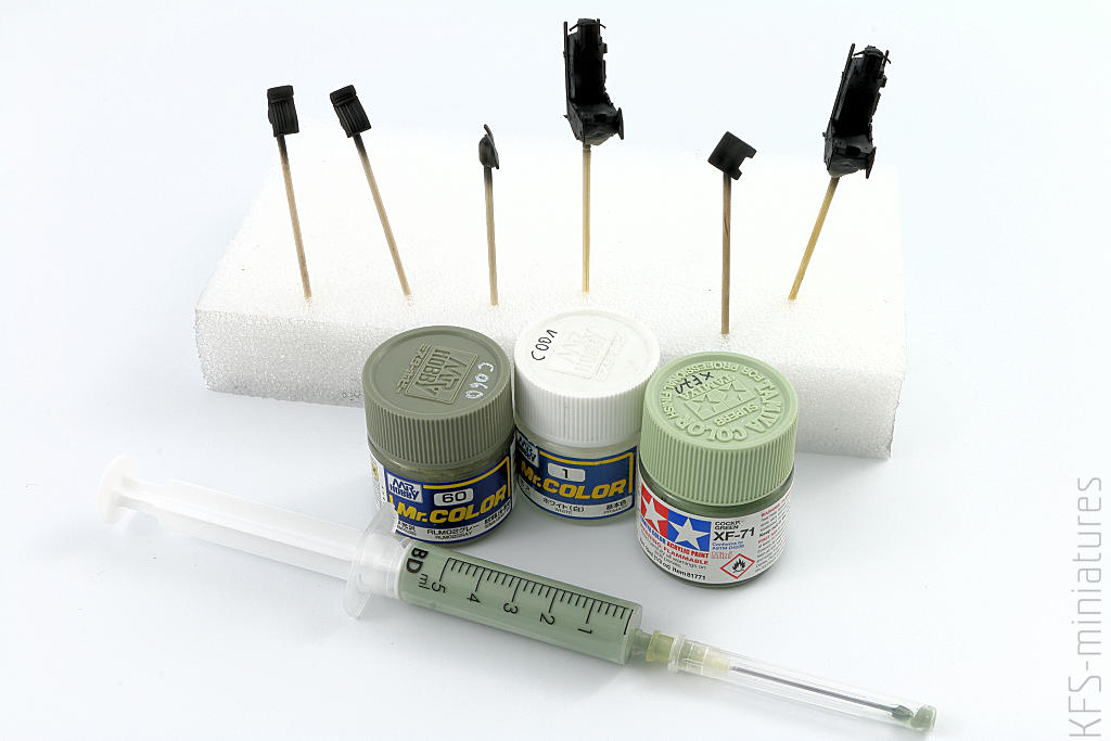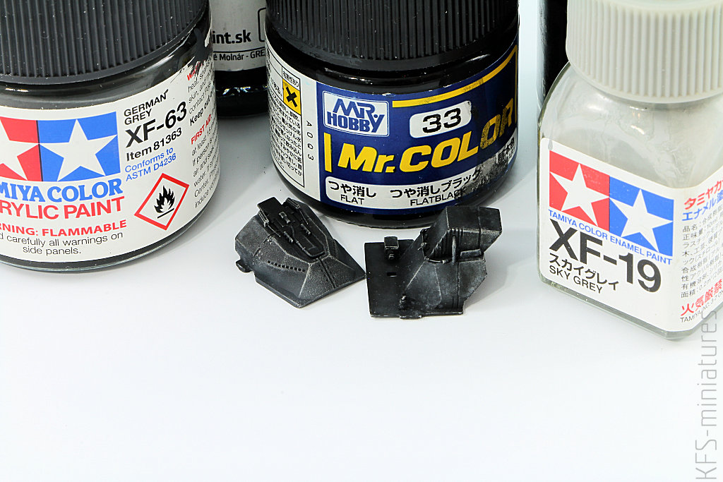 Przyszedł czas na malowanie. Zacząłem od tego, czego najbardziej nie lubię robić, czyli od foteli. Zapodkładowałem je czarnym Surfacerem Gunze. Przy okazji, zmieszałem także farbę do malowania poduszek – dość charakterystyczny odcień szaro-seledynowego. Myślę że ten miks wyszedł mi całkiem nieźle.