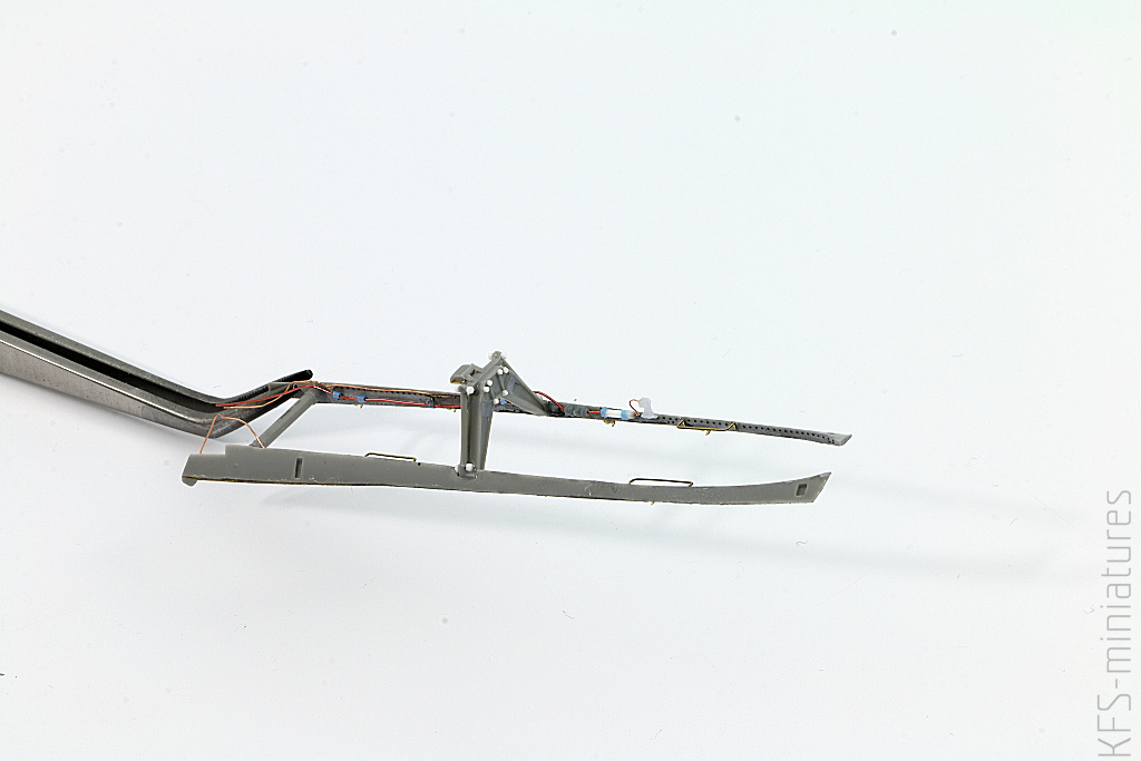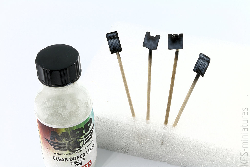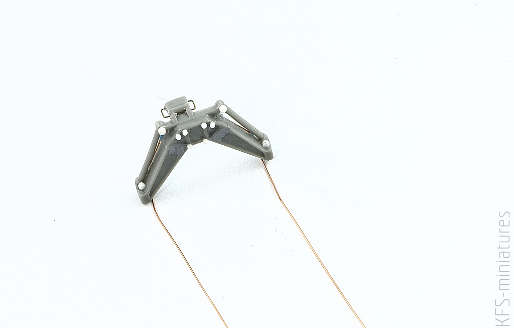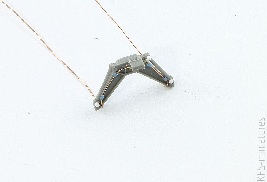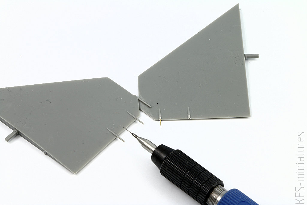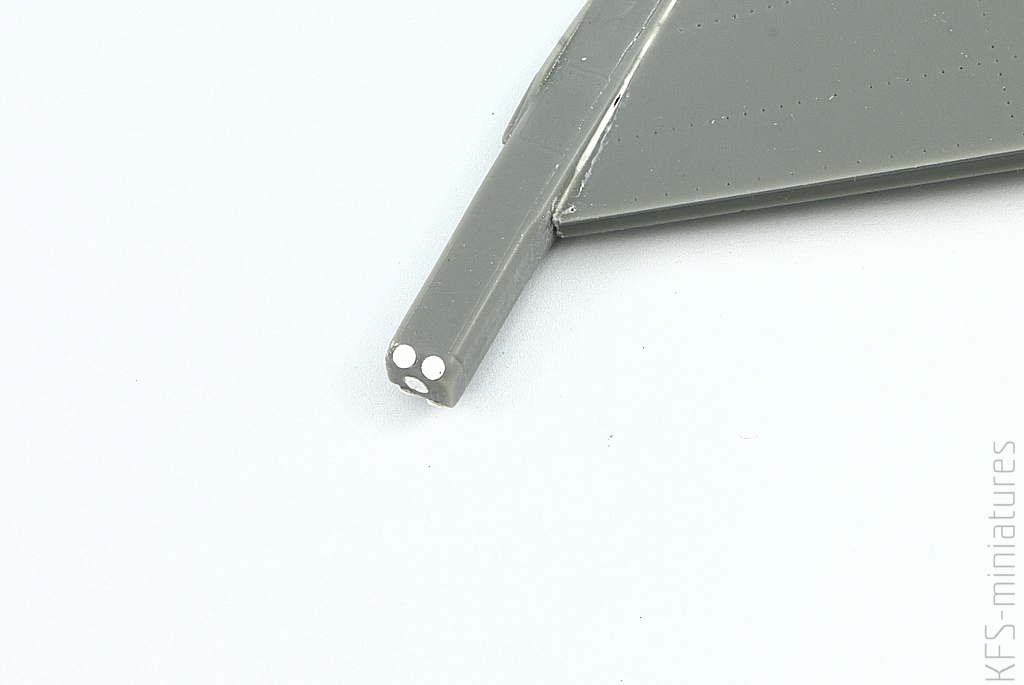 Kinetic razem ze skrzydłami i sterami odlał naprawdę paskudne, grube odgromniki. Rzecz jasna, nie zamierzałem ich zostawić, tylko użyć zamienników Mastera. I tutaj odlewy producenta bardzo mi pomogły. Master sugeruje, aby przed przyklejeniem jego odgromników, zeszlifować powierzchnię plastiku na gładko a następnie wyryć rowek o szerokości 0,3 mm w który należy włożyć odgromnik. Co nie wygląda w efekcie nigdy zbyt dobrze. Ja po prostu uciąłem plastikowe odgromniki i podstawy, a w niej samej nawierciłem otwory o średnicy 0,3 mm. Dzięki temu, dopiero po pomalowaniu modelu wystarczy włożyć tam metalowe detale z odrobiną kleju i pomalować.