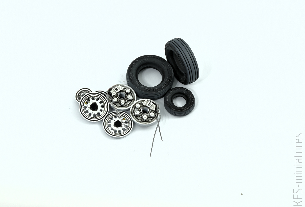 W zestawie D&W znalazły się także koła wraz z oponami. Felgi pomalowałem tym samym lakierem co golenie, dodałem trochę delikatnych imitacji obić, zrobionych miękkim ołówkiem. Hamulce widoczne na wewnętrznych stronach felg uzupełniłem imitacjami przewodów hydraulicznych (z cienkiego drutu miedzianego), których producent nie odtworzył. Pomalowałem także opony, starając się, aby starte powierzchnie bieżnika były wyraźnie jaśniejsze niż boki opony. Podwozie było gotowe do montażu.