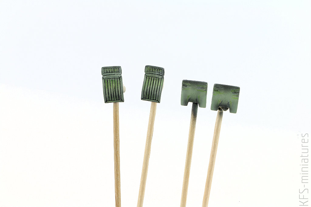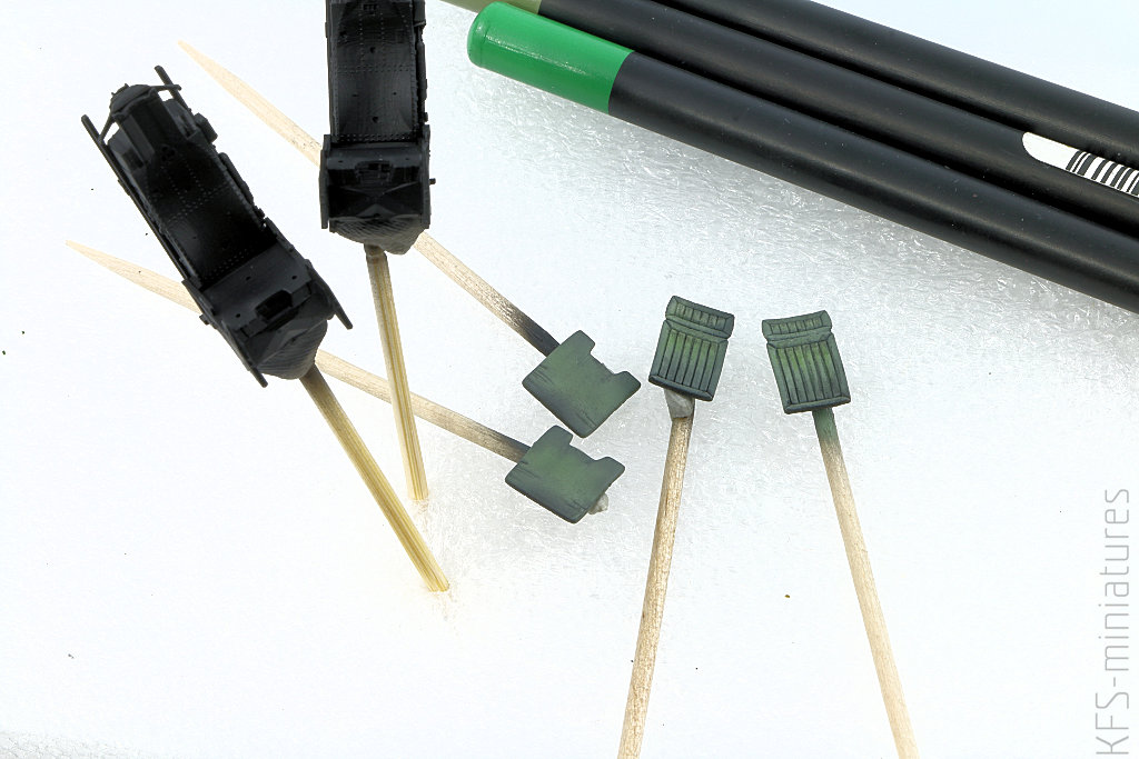 Zbiorniki pomalowałem kolorem FS36375, jednak tym razem użyłem farby z palety Bilmodel. Chodziło mi o to, żeby nawet pozornie ten sam kolor różnił się (gdzie się da) odcieniami. Takie zróżnicowanie zawsze odrobinę podbija atrakcyjność modelu.