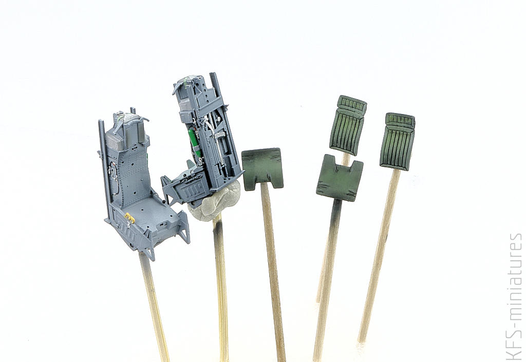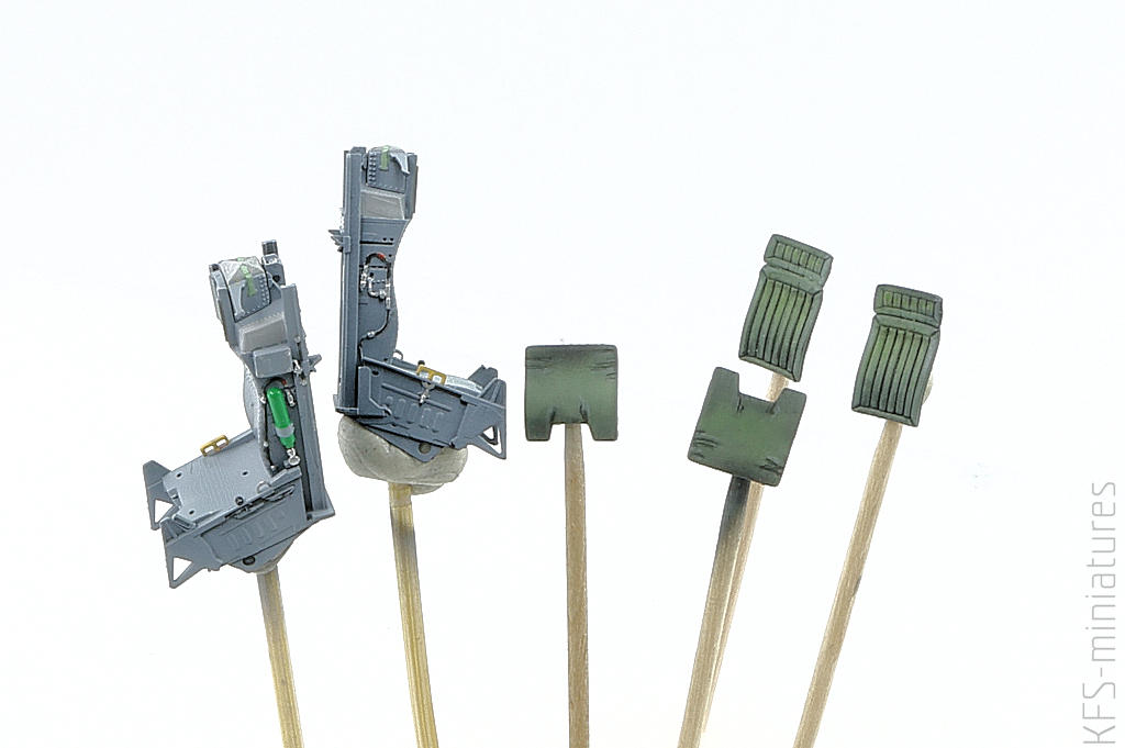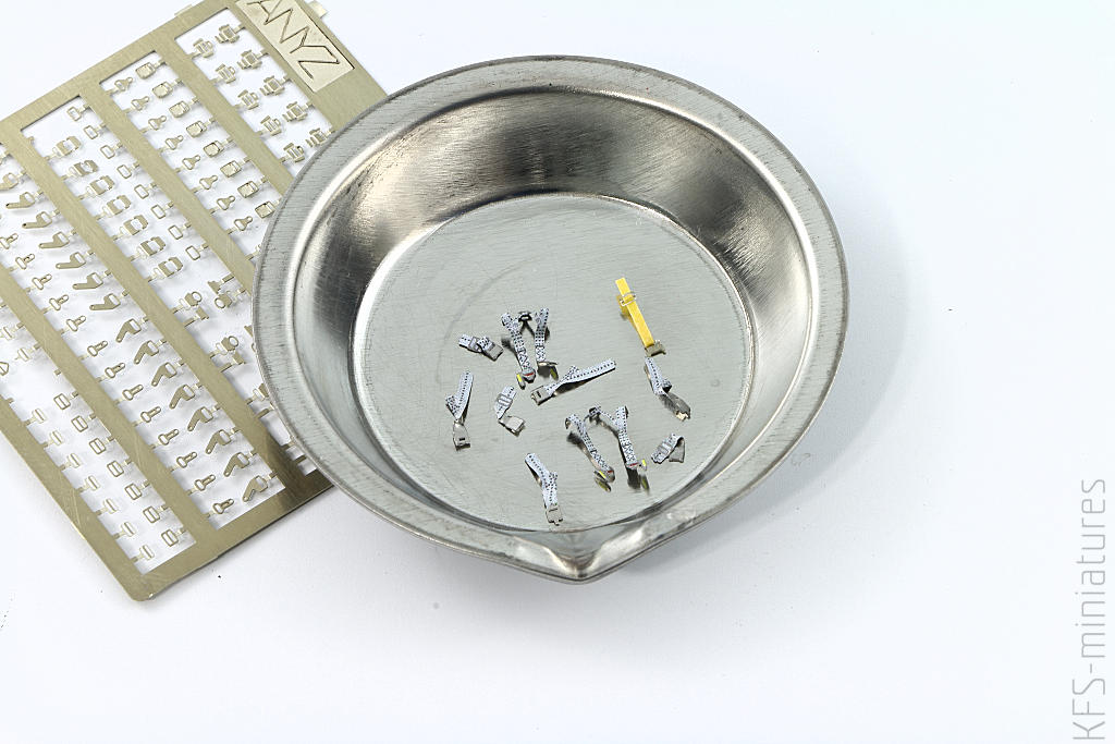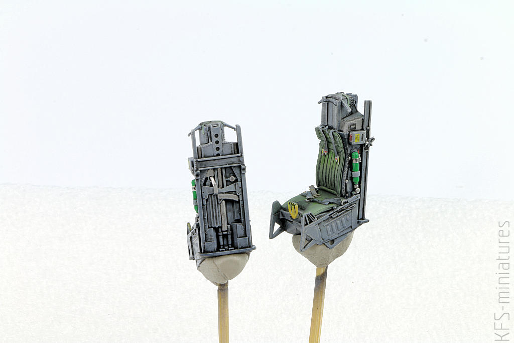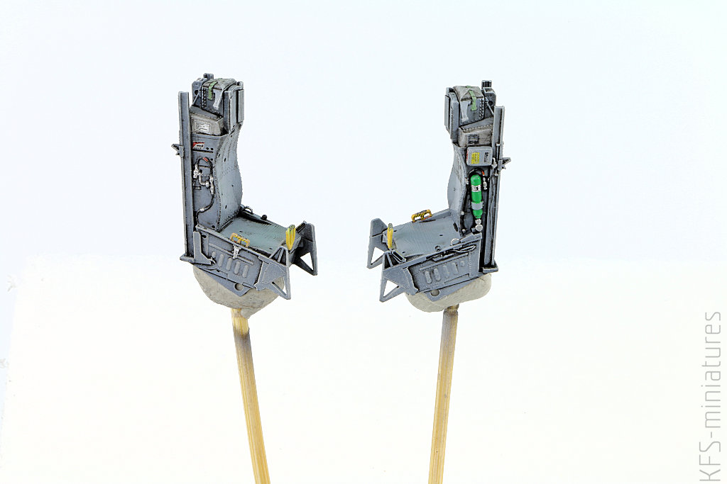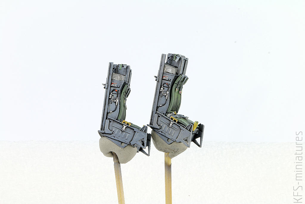 Na sam koniec zostawiłem sobie uprząż pilotów. Eduard do swoich foteli naturalnie dołączył fototrawione pasy, z nadrukowanymi imitacjami splotów. Wygląda to trochę kreskówkowo, do tego raster nadruku jest – jak na mój gust – nieakceptowany. Żeby było jeszcze gorzej, zgubiłem jeden z pasów i musiałem go sobie dorobić. Na szczęście miałem blaszkę Anyza ze sprzączkami do pasów współczesnych odrzutowców. Sam pas dorobiłem z taśmy maskującej Tamiya, na którą nawlokłem rzeczone sprzączki. Wszystkie pasy, przed malowaniem, ułożyłem w taki sposób, w jaki miały być przyklejone do foteli. Starałem się aby każdy pas leżał nieco inaczej, niż wszystkie pozostałe – tak jak to jest w rzeczywistości.