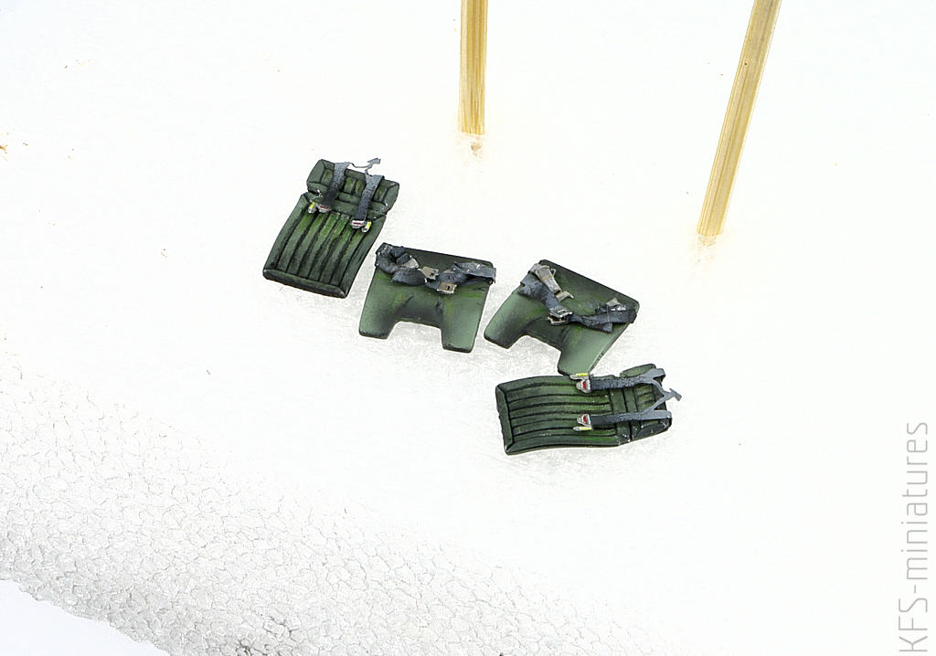 Po poduszkach przyszedł czas na same fotele. Najpierw pomalowałem je kolorem FS36375 z palety MR Paint. Wszelkie detale, jakich na tych fotelach nie brakuje, malowałem albo pędzelkiem, albo – jak w przypadku butli z tlenem, aerografem.