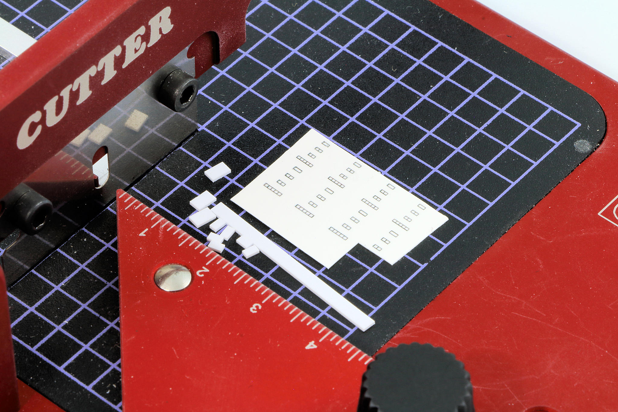 F-16 ma dość charakterystyczne lampki ostrzegawcze mieszczące się na krawędziach osłon antyodblaskowych. Naturalnie Kinetic niczego takiego nie zrobił, musiałem więc sobie poradzić inaczej. Najpierw wyciąłem kawałki plastiki z profilu Evergreen o odpowiedniej grubości – 0,4 mm. Jako że nie udało mi się naciąć tych profili tak, aby imitowały rzędy lampek, wpadłem na pomysł że to wszystko po prostu narysuję. W tym celu wydrukowałem kształty przycisków na przezroczystym papierze do kalkomanii.
