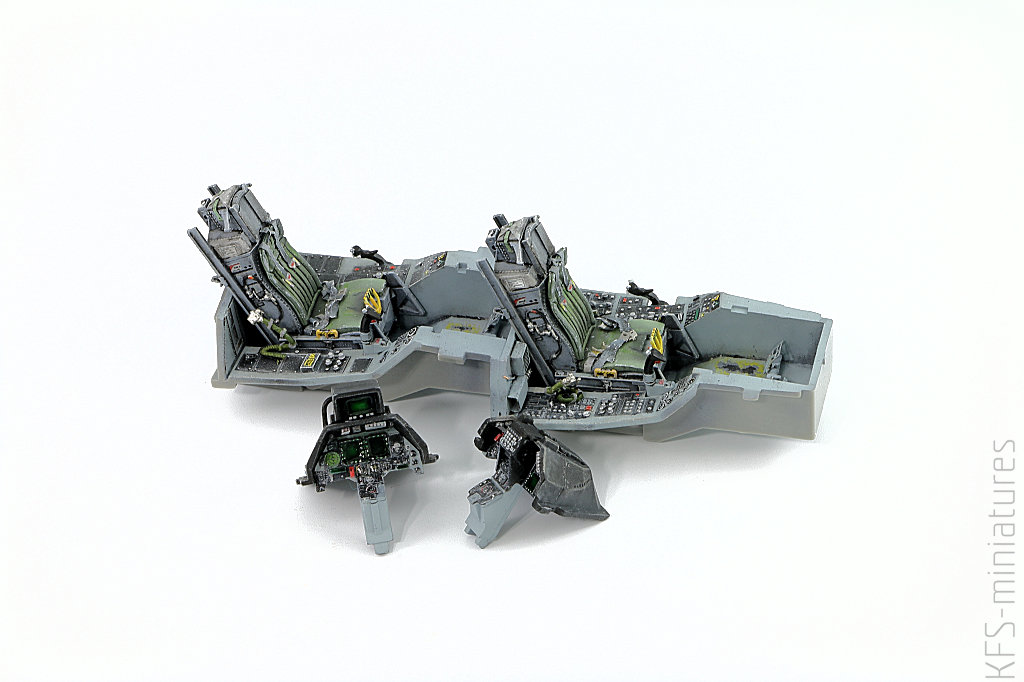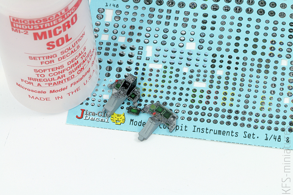 Fotele to był jednak dopiero początek prac nad kabiną. Kolejnym krokiem były tablice przyrządów. Kinetic co prawda dostarczył kalkomanie z zegarami i ekranami do tych elementów, ja jednak wolałem zrobić je nieco dokładniej. W tym celu użyłem kalkomanii z zegarami Airscale oraz Jira-GIO Decal. Mimo prób, nie udało mi się dobrze pomalować mikroskopijnych przycisków wokół wyświetlaczy. Użyłem więc zestawowych kalkomanii, ale potem pomalowałem same ekrany: najpierw jasnym, szarym kolorem, a na to nałożyłem pędzelkiem grube warstwy Tamiya Green Clear.