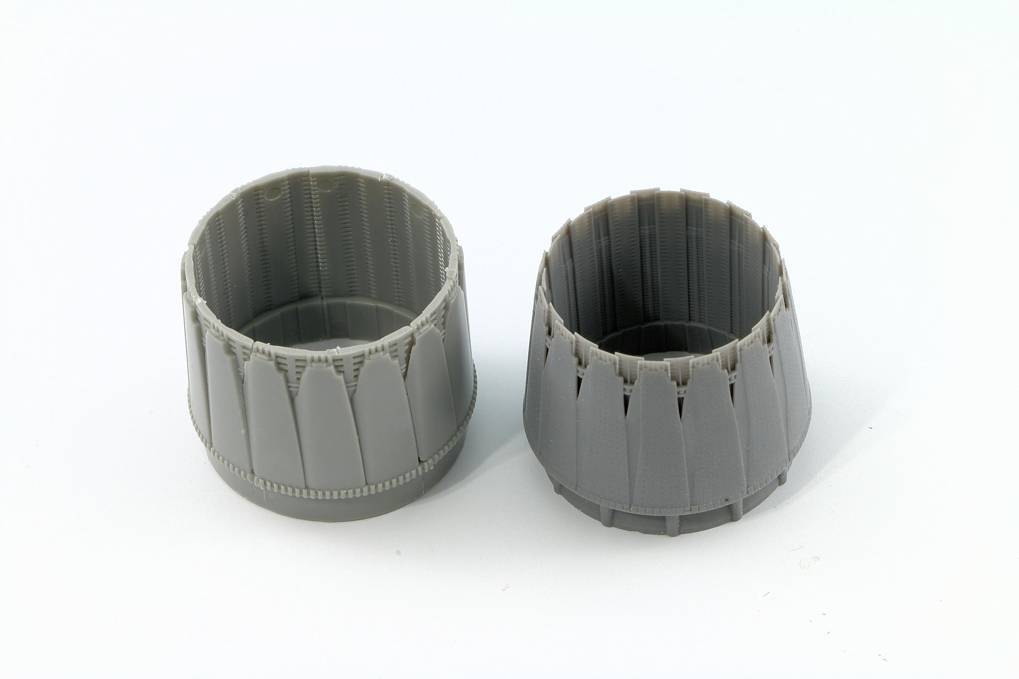 Mam taką żelazną zasadę związaną z robieniem modeli, że zawsze staram się używać żywicznych dysz silników, zamiast zestawowych. A to głównie dlatego, że te żywiczne mają znacznie cieńsze krawędzie lamelek i po prostu lepiej wyglądają. O detalach już nie będę wspominać, bo to oczywiste. Dysza Kinetica jest nieco zbyt toporna, dlatego postanowiłem użyć drukowanego w technologii 3D zamiennika firmy Galaxy Models. Jest to w tej chwili jedna z najładniejszych żywic do modeli F-16 z silnikiem Pratt & Whitney.