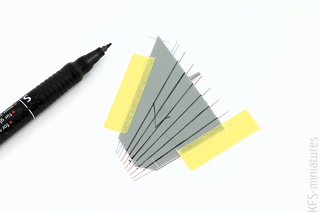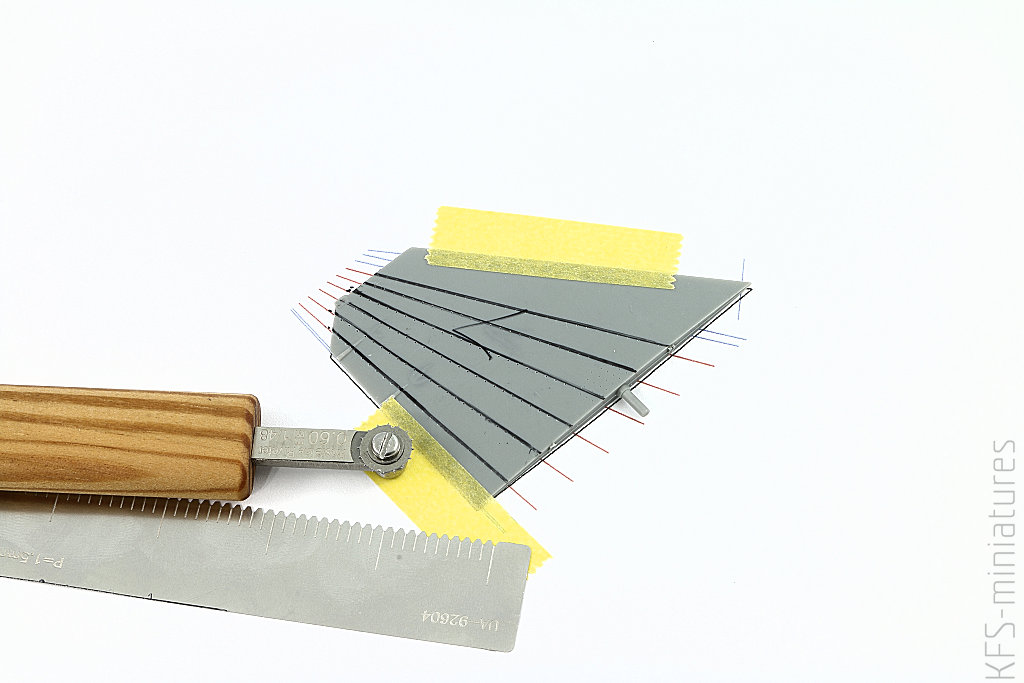 Samo nitowanie to prosta sprawa, bo stateczniki są płaskie, a linie nitów proste. Najpierw narysowałem sobie rzeczone linie na plastiku, choć jak potem się okazało, zupełnie niepotrzebnie, bo wystarczyła cienka metalowa linijka do prowadzenia nitowadła.