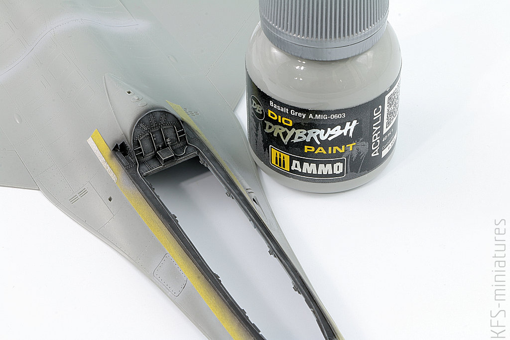 Żeby nadać temu miejscu odrobinę wyrazu i podbić wszystkie detale, pociągnąłem pomalowane powierzchnie dość mocnym suchym pędzlem, używając szarej farby Ammo of Mig. Wiem, że efekt wyszedł nieco przesadzony, ale robiąc takie zakamarki trzeba pamiętać, że finalnie będą one mocno zasłonięte fotelem oraz osadzoną owiewką, więc tylko mocne efekty będą dawały jakieś widoczne efekty.