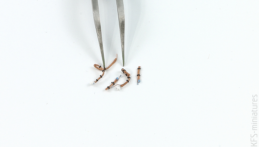 Na koniec prac nad kokpitem postanowiłem dorobić karbowane przewody tlenowe. Do tego celu użyłem cienkiego drutu miedzianego. Imitacje opasek wykonałem z taśmy klejącej, choć teraz widzę że lepiej byłoby je zrobić po prostu z odpowiednio dobranych pasków kalkomanii. Dorobiłem też – na podstawie zdjęć – nieznanego mi przeznaczenia zakończenia tychże przewodów.