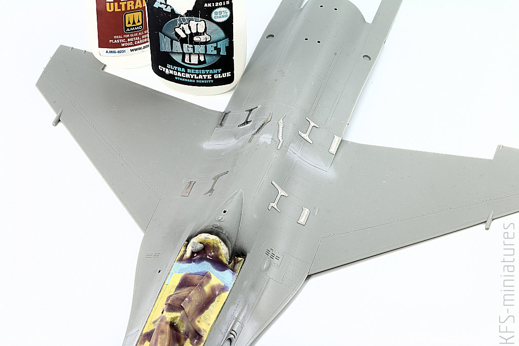 Lubię, kiedy z modelem coś się dzieje, dlatego zdecydowałem się otworzyć hamulce aerodynamiczne. Zresztą na wielu zdjęciach ten element stojącego na płycie lotniska F-16 jest właśnie otwarty. Kinetic nie przewidział takiej opcji w budowie, musiałem więc użyć żywicznego zamiennika Eduarda. Zamiennika zresztą całkiem ładnego i dobrze zdetalowanego. Tylko że idiotycznie zaprojektowanego. Nie ma w modelu F-16 chyba bardziej narażonego elementu do oderwania w trakcie budowy, niż otwarte klapy hamulca. A Eduard wymyślił sobie, że te dedykowane Kineticowi (bo do modelu Tamiya już tak na szczęście nie jest) będą wydrukowane jako całość. A tu aż prosi się o to, żeby same klapki można było przykleić po skończeniu modelu. Nie zliczę ile razy w trakcie budowy odrywałem niechcący, a potem kleiłem te elementy. Ale to tylko dygresja, wróćmy do budowy.