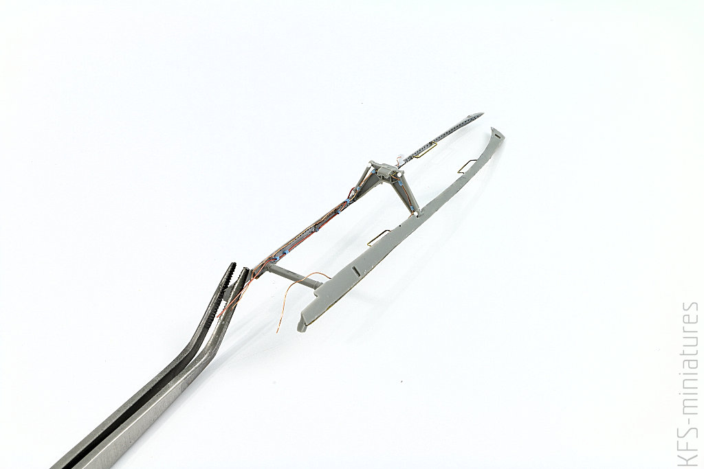 Mój Viper miał mieć otwartą kabinę, co w przypadku F-16D skutkuje widocznością wszystkich detali, jakie tam mogą się znaleźć. Dlatego też postanowiłem wzbogacić osłony antyodblaskowe kilkoma drobiazgami. Przede wszystkim odtworzyłem widoczne tam okablowanie, używając miedzianego drutu oraz drobnych drukowanych elementów żywicznych.