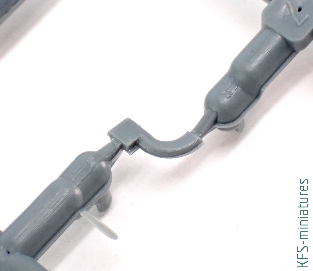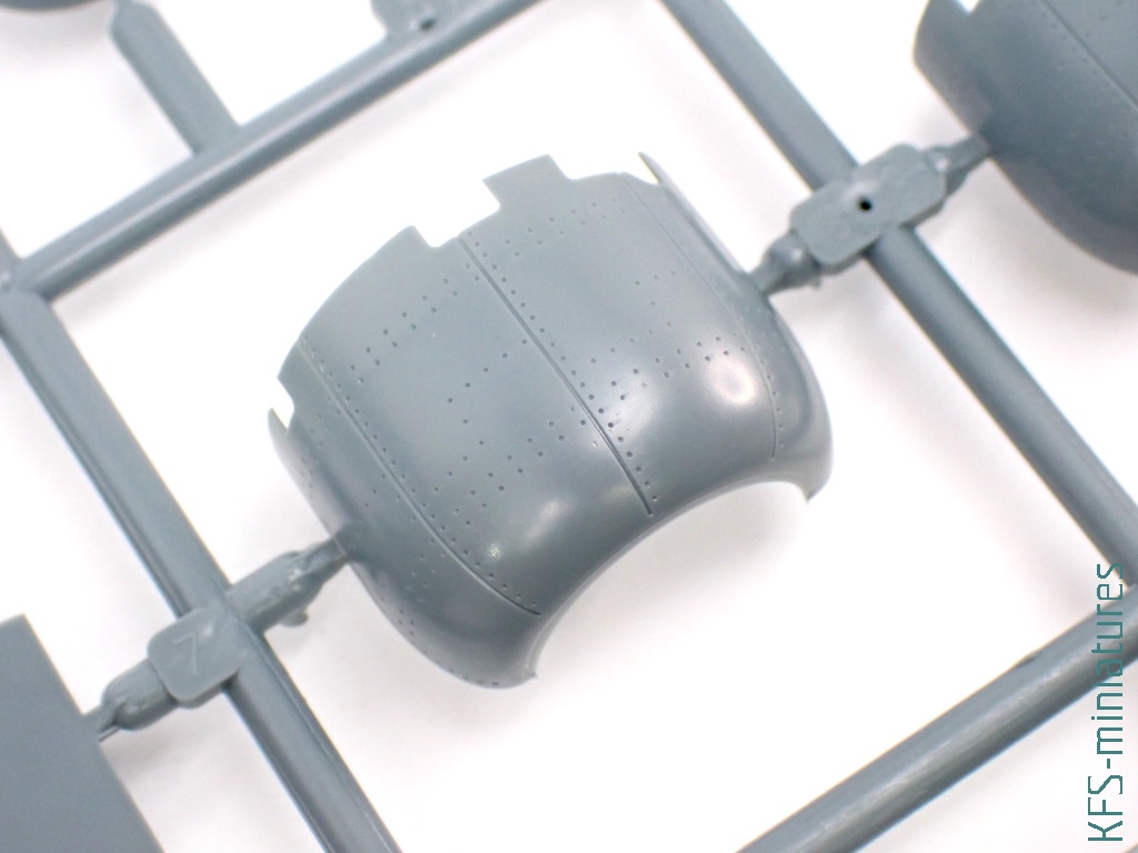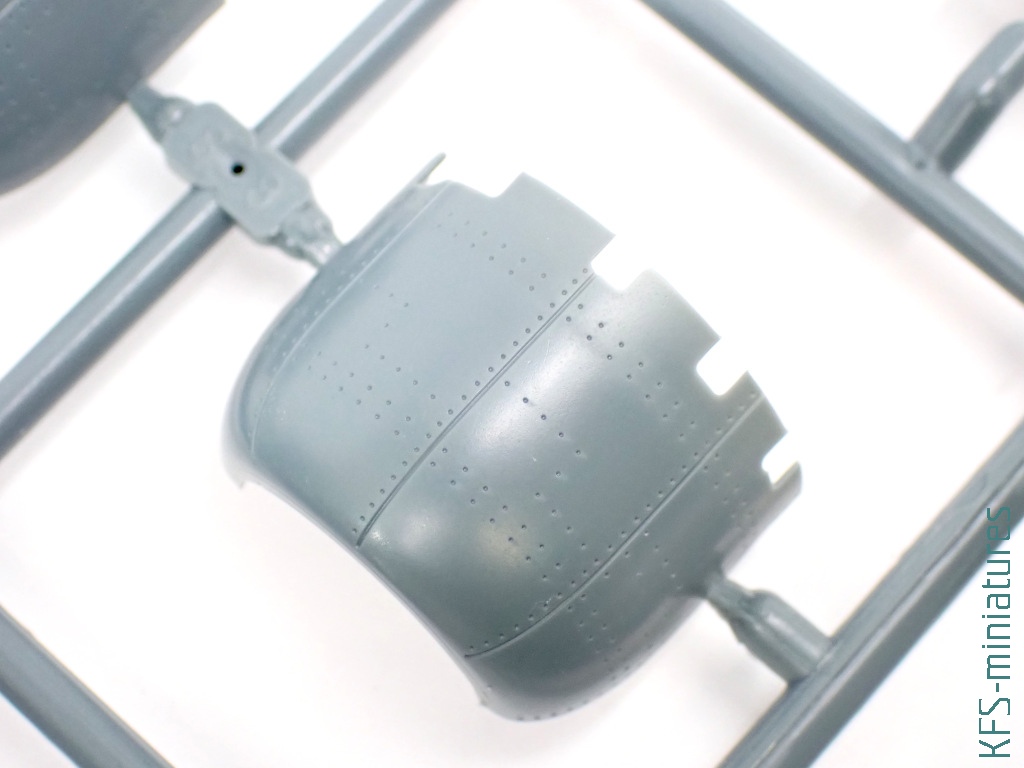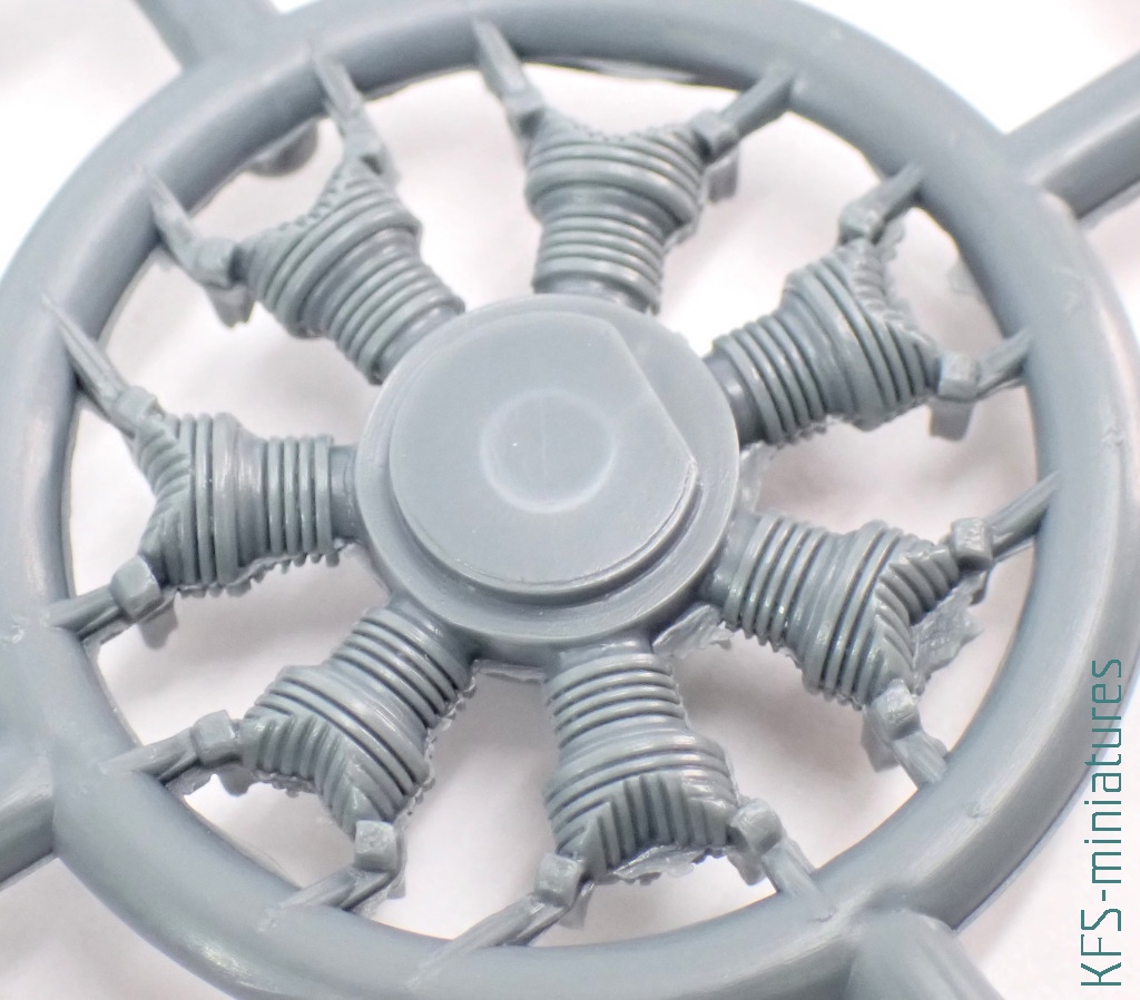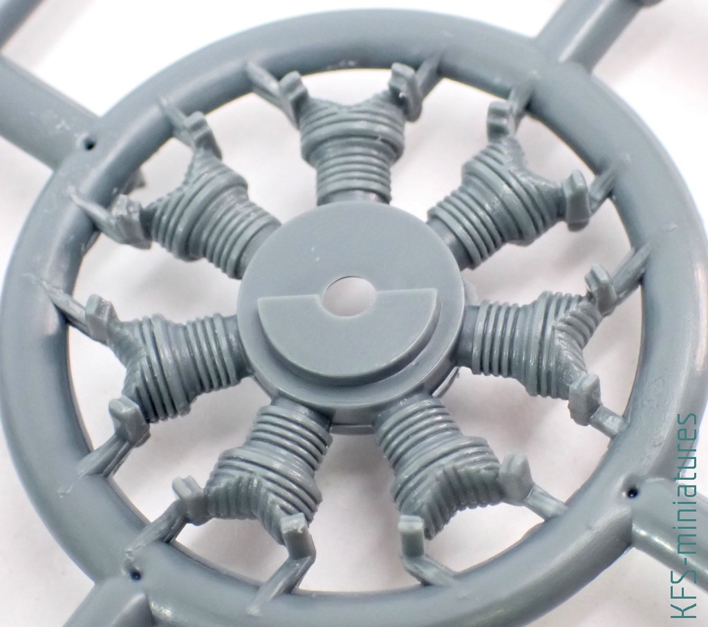 Silnik nie jest w tym samolocie przesadnie eksponowany. Niemniej jednak jego makieta ma nawet trochę szczegółów (oraz kolejne nadlewki). Przy okazji – nietypowo zaprojektowany jest układ wydechowy – imitacje jego rur montuje się do ściany ogniowej. Nie muszę chyba dodawać, że owe rury wymagają uprzedniego nawiercenia
