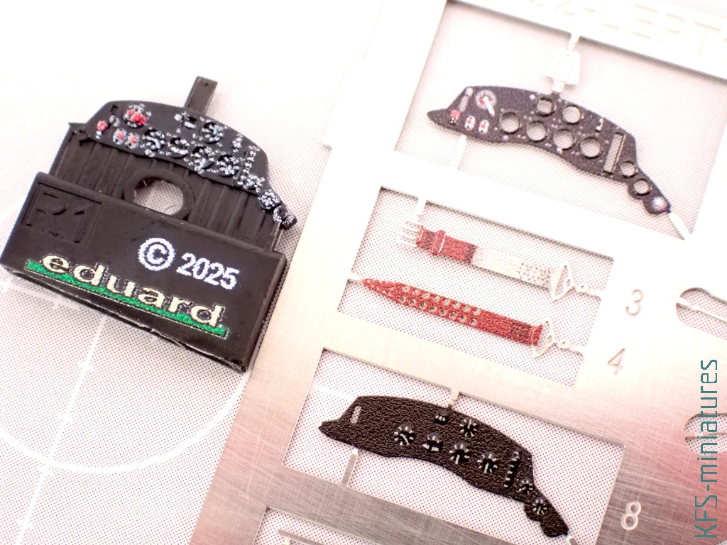 Plastikową tablicę przyrządów można okleić albo kalkomanią, albo fototrawioną blaszką. I po bliższym spojrzeniu wybór jest dość oczywisty