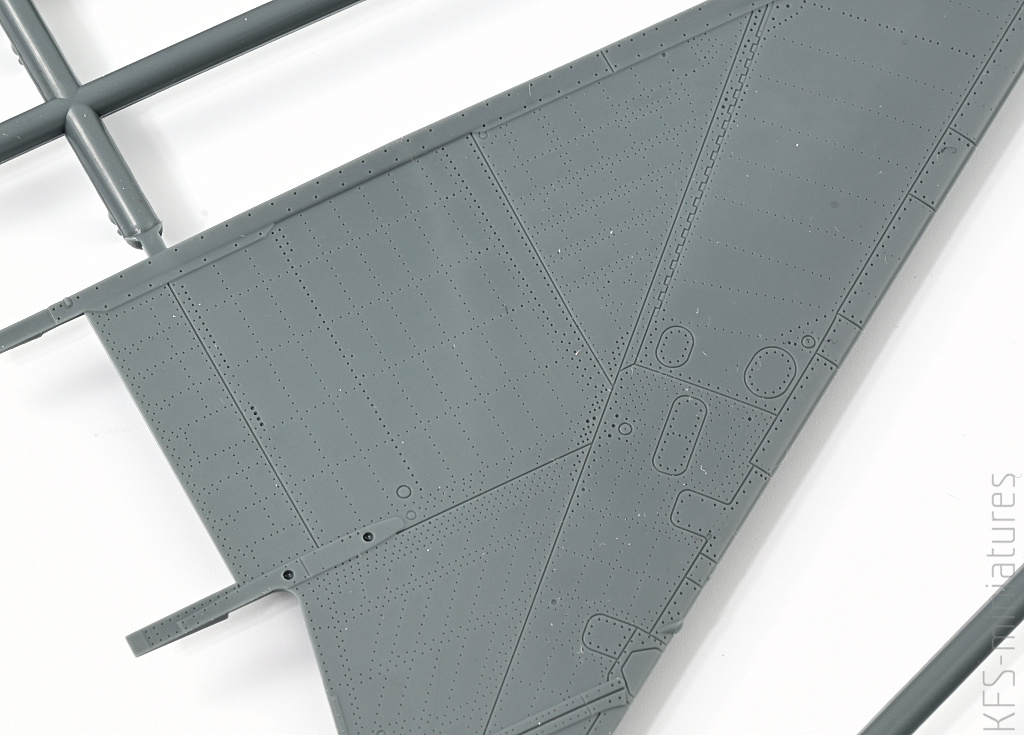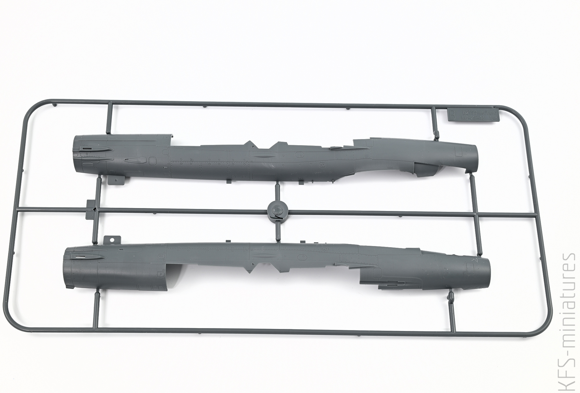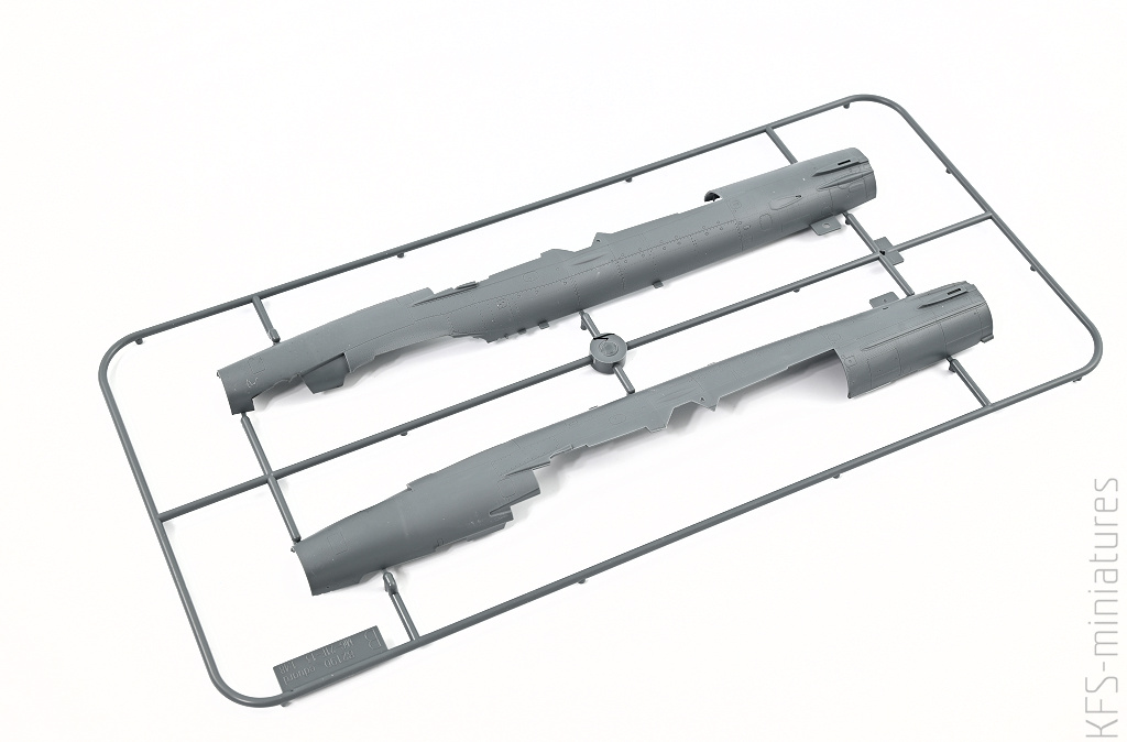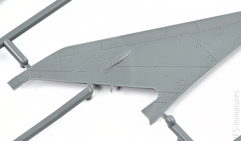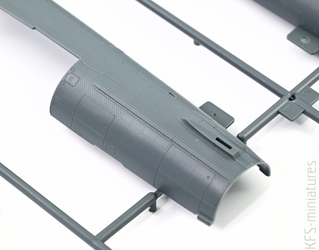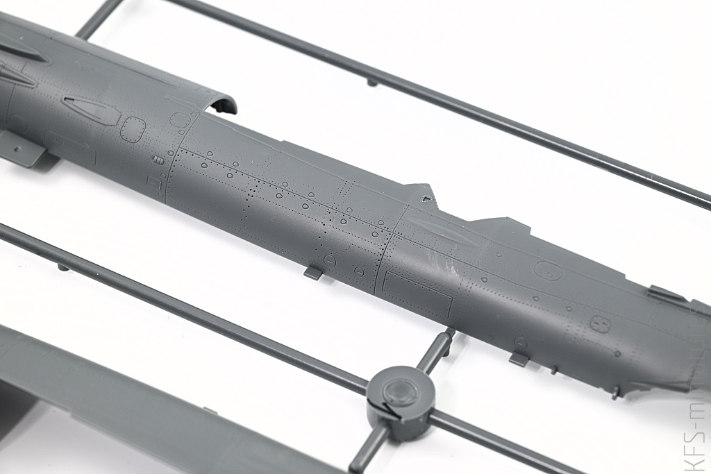 Model na wypraskach jest – co tu dużo mówić – efektowny. Już sam kadłub wygląda ładnie. Mamy tu mnóstwo grubszych i drobniejszych nitów, bardzo delikatne ale wyraźne linie podziału i naprawdę masę wszelkiej maści detali: paneli inspekcyjnych, rewizji i wszelkiego innego dobra. I co ważne, nic tu nie jest przesadzone, czy wepchnięte na siłę. Równowaga między liniami nitów o różnych rozmiarach jest zachowana, nie ma mowy o przesadzie. To wszystko wygląda naturalnie i po prostu realistycznie, a do tego zgrabnie i finezyjnie. Co istotne, dzięki strukturze podziału bryły płatowca, tylko niewielki procent krawędzi kadłuba będzie wymagał podczas montażu szlifowania i odtwarzania tych wszystkich drobiazgów. Chyba nie muszę pisać, jak dobrze to rokuje w przypadku budowania modelu malowanego w kolorze naturalnego metalu. Zresztą sam podział technologiczny kadłuba jest niemal identyczny jak w starych MiGach.