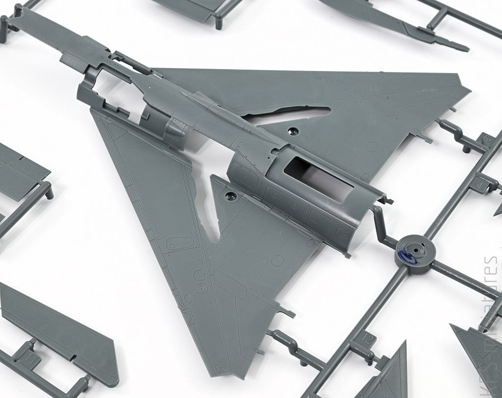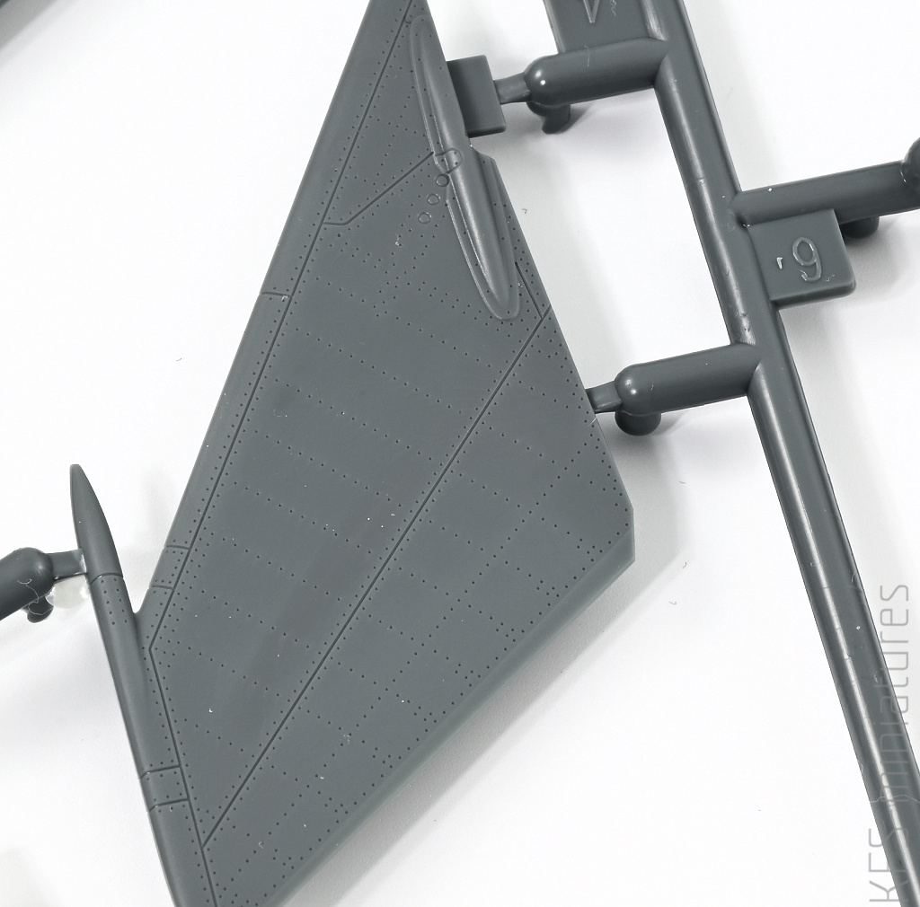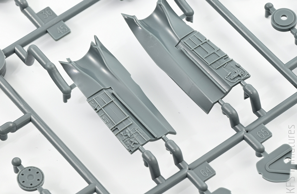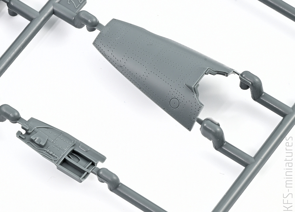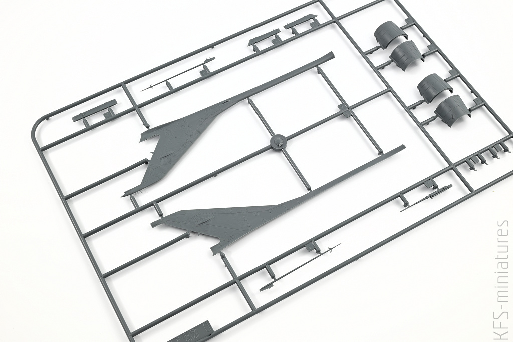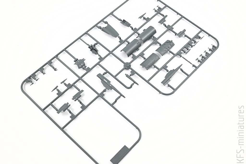 Model na wypraskach jest – co tu dużo mówić – efektowny. Już sam kadłub wygląda ładnie. Mamy tu mnóstwo grubszych i drobniejszych nitów, bardzo delikatne ale wyraźne linie podziału i naprawdę masę wszelkiej maści detali: paneli inspekcyjnych, rewizji i wszelkiego innego dobra. I co ważne, nic tu nie jest przesadzone, czy wepchnięte na siłę. Równowaga między liniami nitów o różnych rozmiarach jest zachowana, nie ma mowy o przesadzie. To wszystko wygląda naturalnie i po prostu realistycznie, a do tego zgrabnie i finezyjnie. Co istotne, dzięki strukturze podziału bryły płatowca, tylko niewielki procent krawędzi kadłuba będzie wymagał podczas montażu szlifowania i odtwarzania tych wszystkich drobiazgów. Chyba nie muszę pisać, jak dobrze to rokuje w przypadku budowania modelu malowanego w kolorze naturalnego metalu. Zresztą sam podział technologiczny kadłuba jest niemal identyczny jak w starych MiGach.