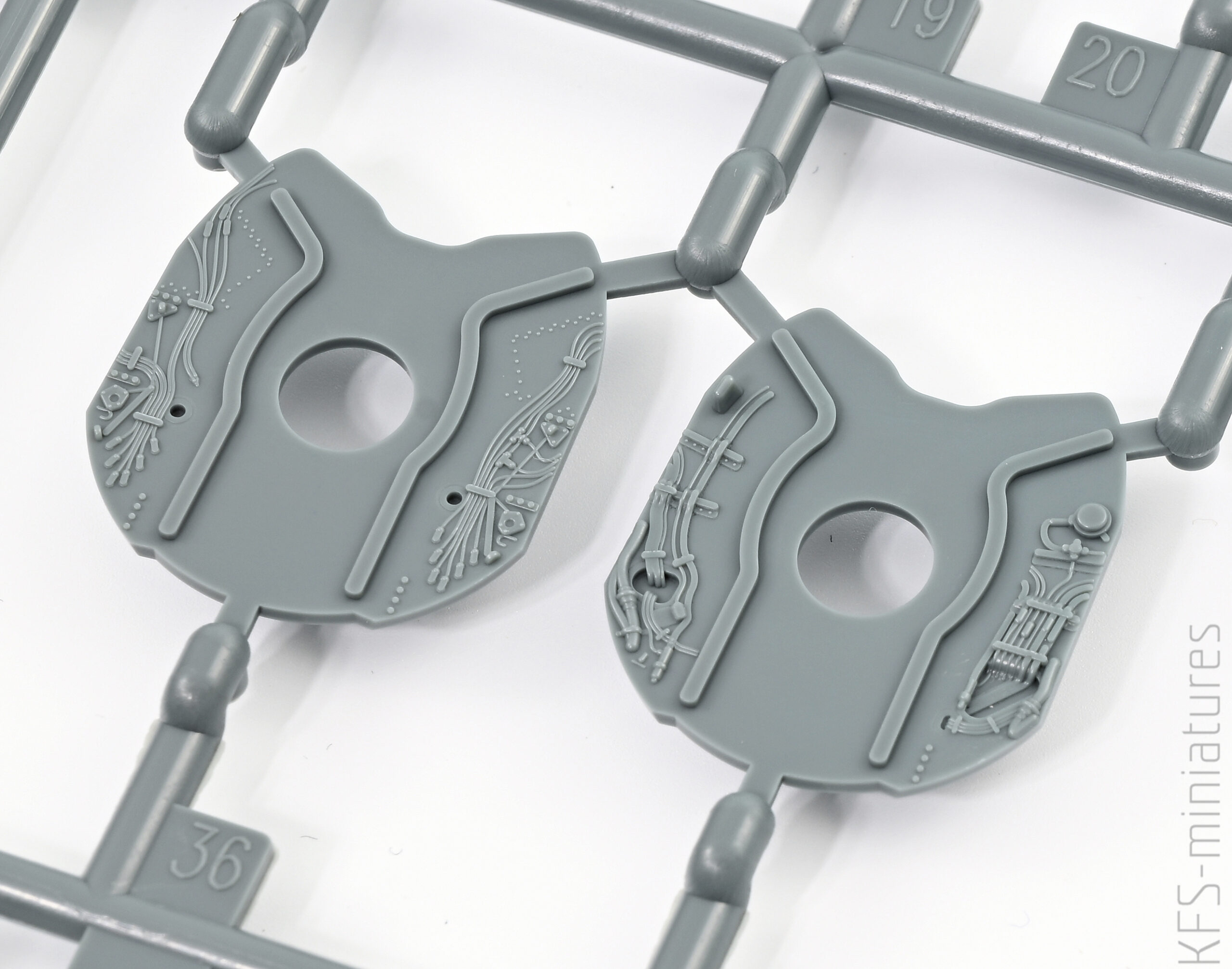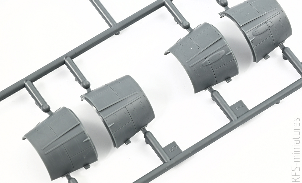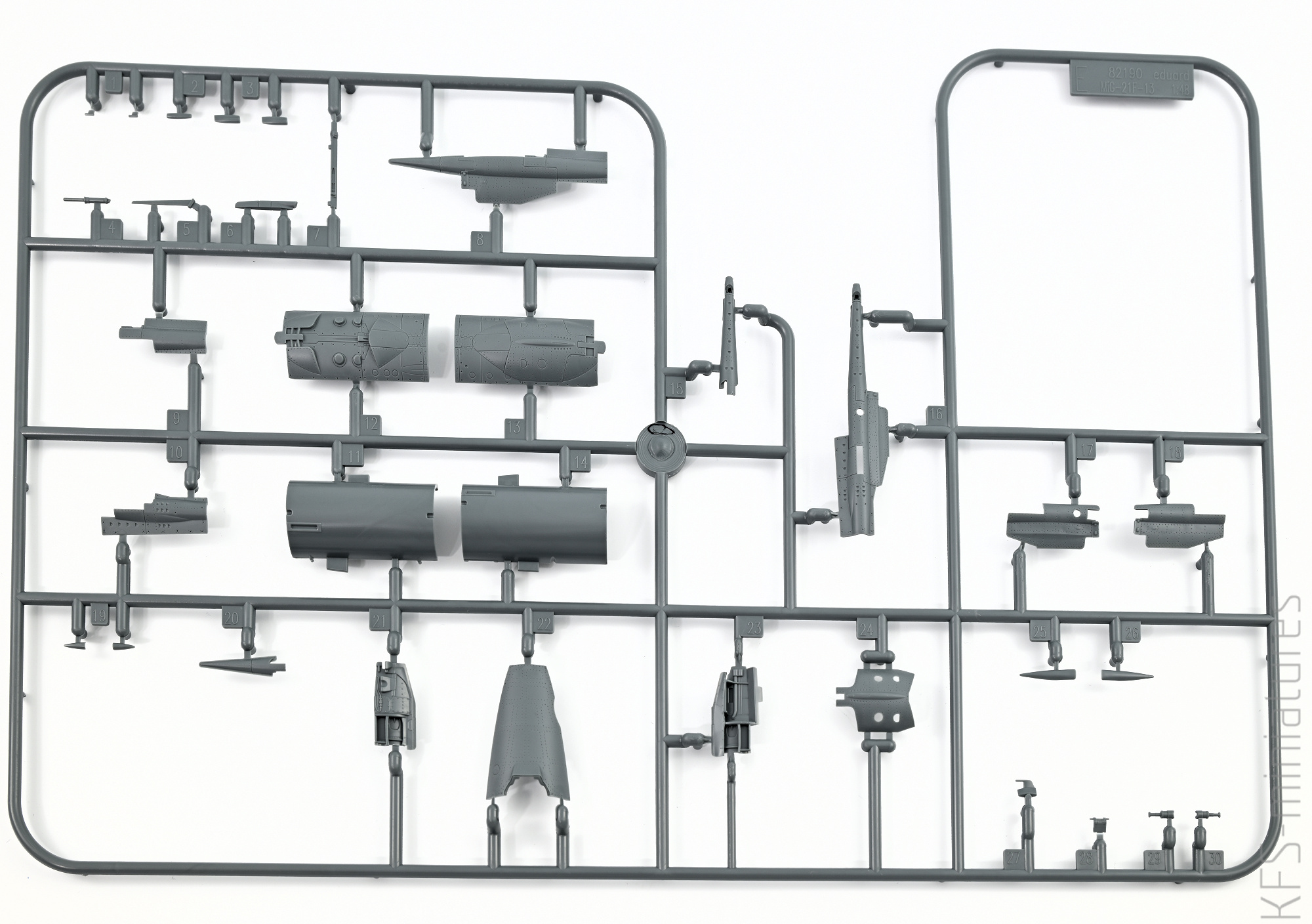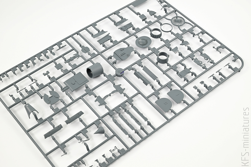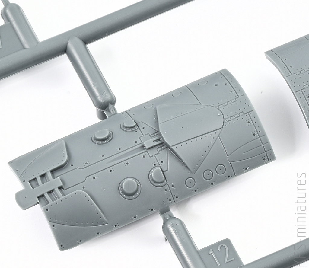 Model na wypraskach jest – co tu dużo mówić – efektowny. Już sam kadłub wygląda ładnie. Mamy tu mnóstwo grubszych i drobniejszych nitów, bardzo delikatne ale wyraźne linie podziału i naprawdę masę wszelkiej maści detali: paneli inspekcyjnych, rewizji i wszelkiego innego dobra. I co ważne, nic tu nie jest przesadzone, czy wepchnięte na siłę. Równowaga między liniami nitów o różnych rozmiarach jest zachowana, nie ma mowy o przesadzie. To wszystko wygląda naturalnie i po prostu realistycznie, a do tego zgrabnie i finezyjnie. Co istotne, dzięki strukturze podziału bryły płatowca, tylko niewielki procent krawędzi kadłuba będzie wymagał podczas montażu szlifowania i odtwarzania tych wszystkich drobiazgów. Chyba nie muszę pisać, jak dobrze to rokuje w przypadku budowania modelu malowanego w kolorze naturalnego metalu. Zresztą sam podział technologiczny kadłuba jest niemal identyczny jak w starych MiGach.