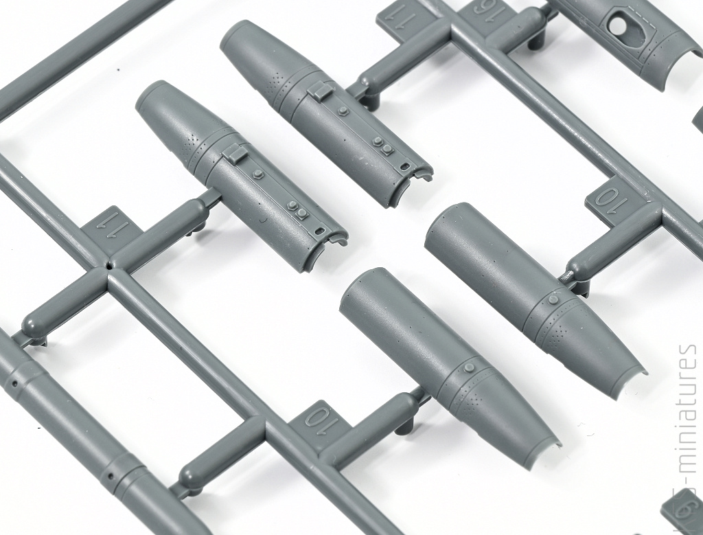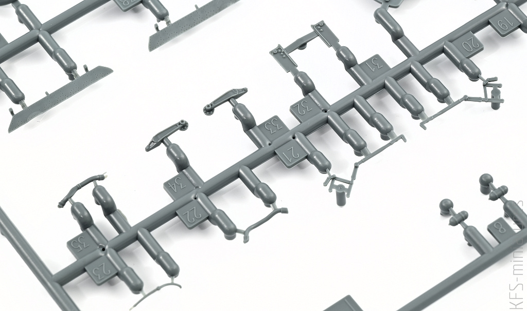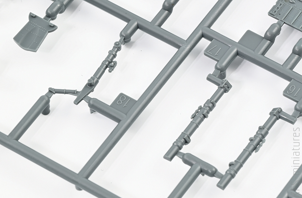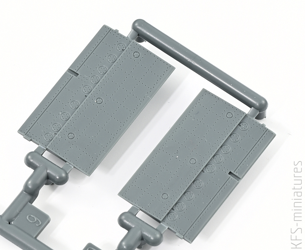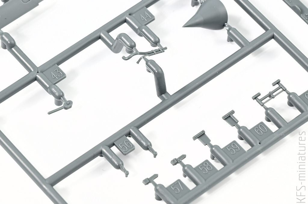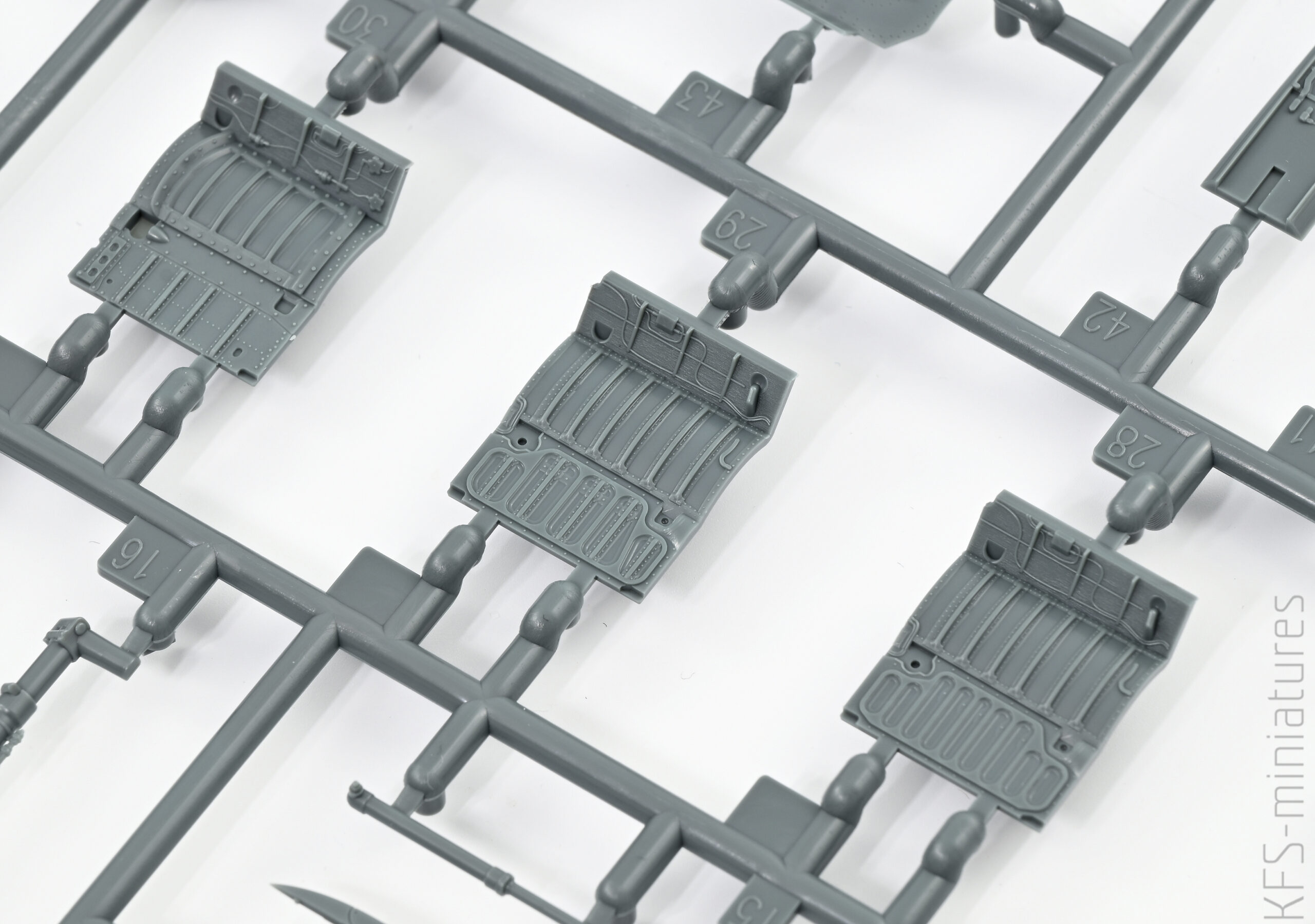 Model na wypraskach jest – co tu dużo mówić – efektowny. Już sam kadłub wygląda ładnie. Mamy tu mnóstwo grubszych i drobniejszych nitów, bardzo delikatne ale wyraźne linie podziału i naprawdę masę wszelkiej maści detali: paneli inspekcyjnych, rewizji i wszelkiego innego dobra. I co ważne, nic tu nie jest przesadzone, czy wepchnięte na siłę. Równowaga między liniami nitów o różnych rozmiarach jest zachowana, nie ma mowy o przesadzie. To wszystko wygląda naturalnie i po prostu realistycznie, a do tego zgrabnie i finezyjnie. Co istotne, dzięki strukturze podziału bryły płatowca, tylko niewielki procent krawędzi kadłuba będzie wymagał podczas montażu szlifowania i odtwarzania tych wszystkich drobiazgów. Chyba nie muszę pisać, jak dobrze to rokuje w przypadku budowania modelu malowanego w kolorze naturalnego metalu. Zresztą sam podział technologiczny kadłuba jest niemal identyczny jak w starych MiGach.
