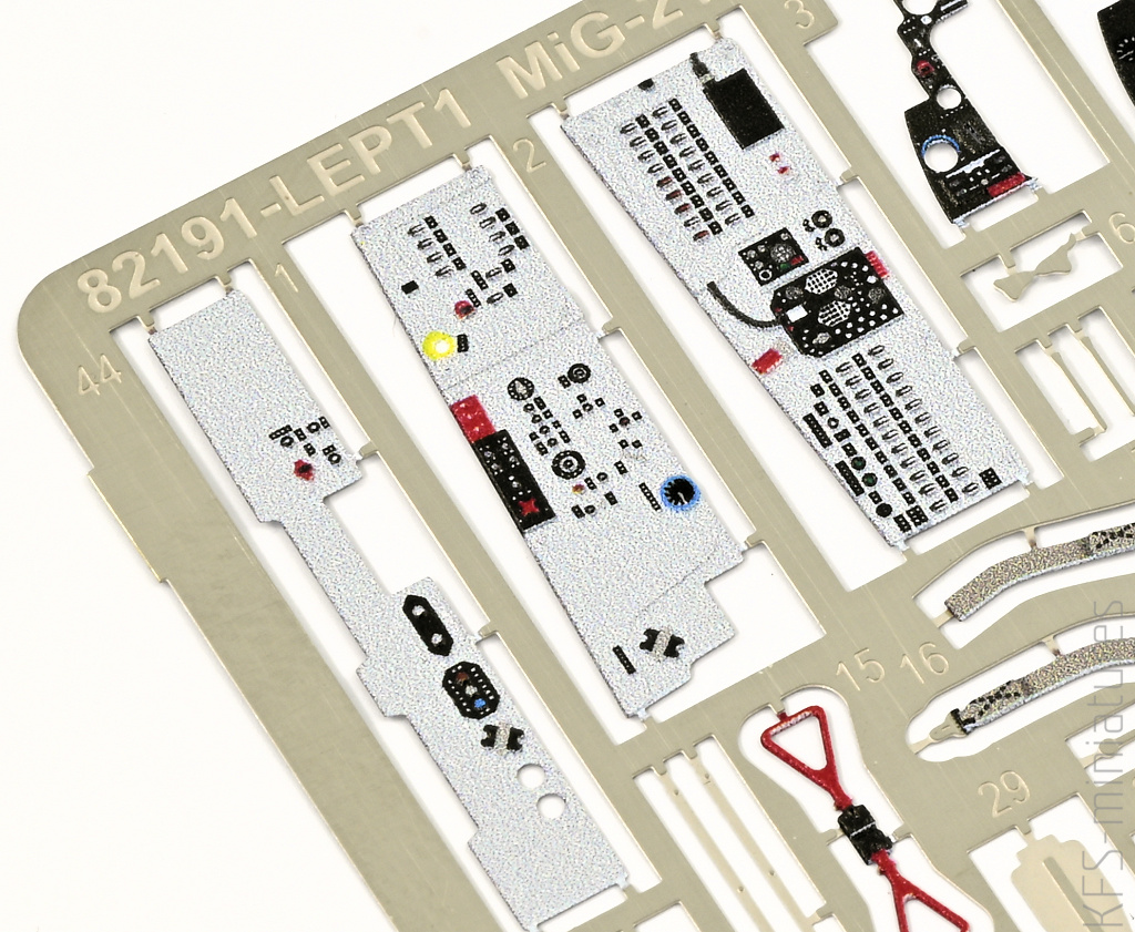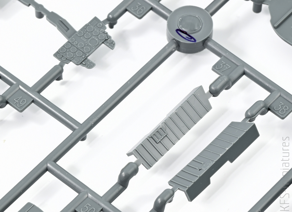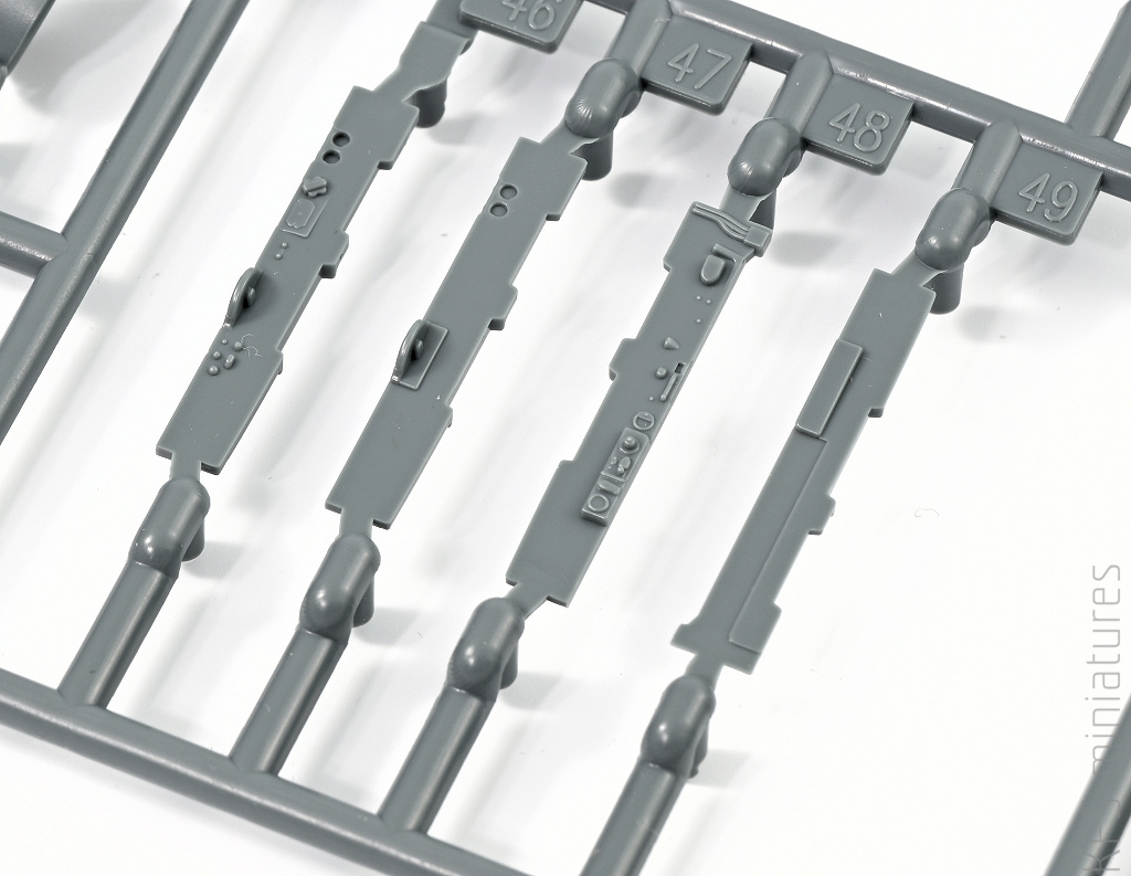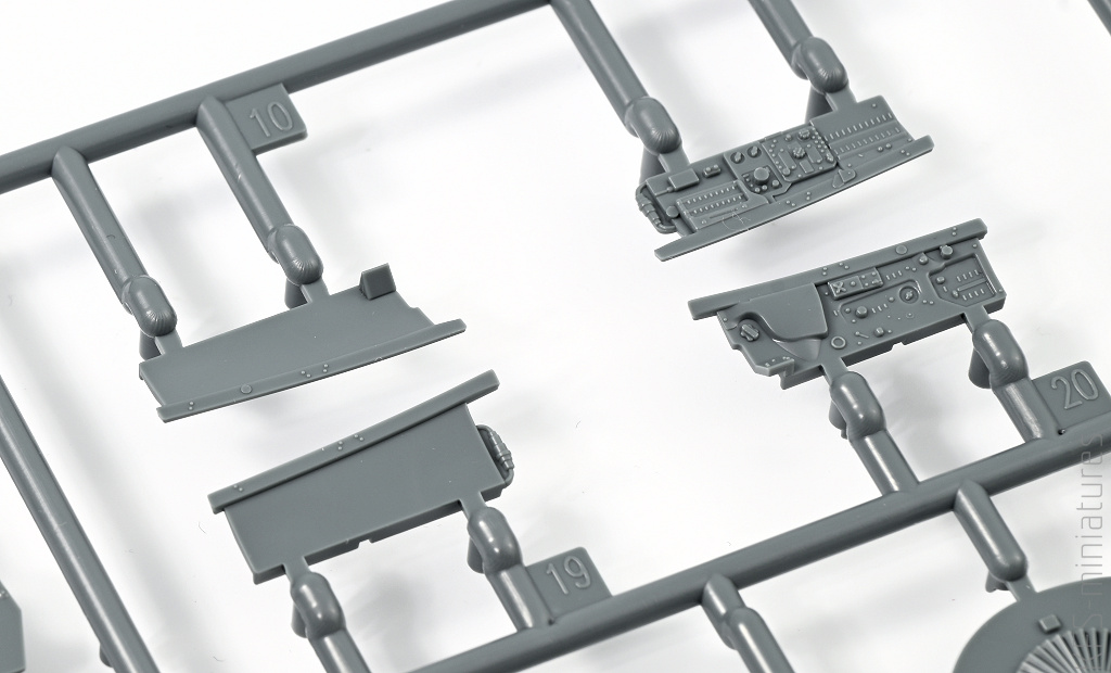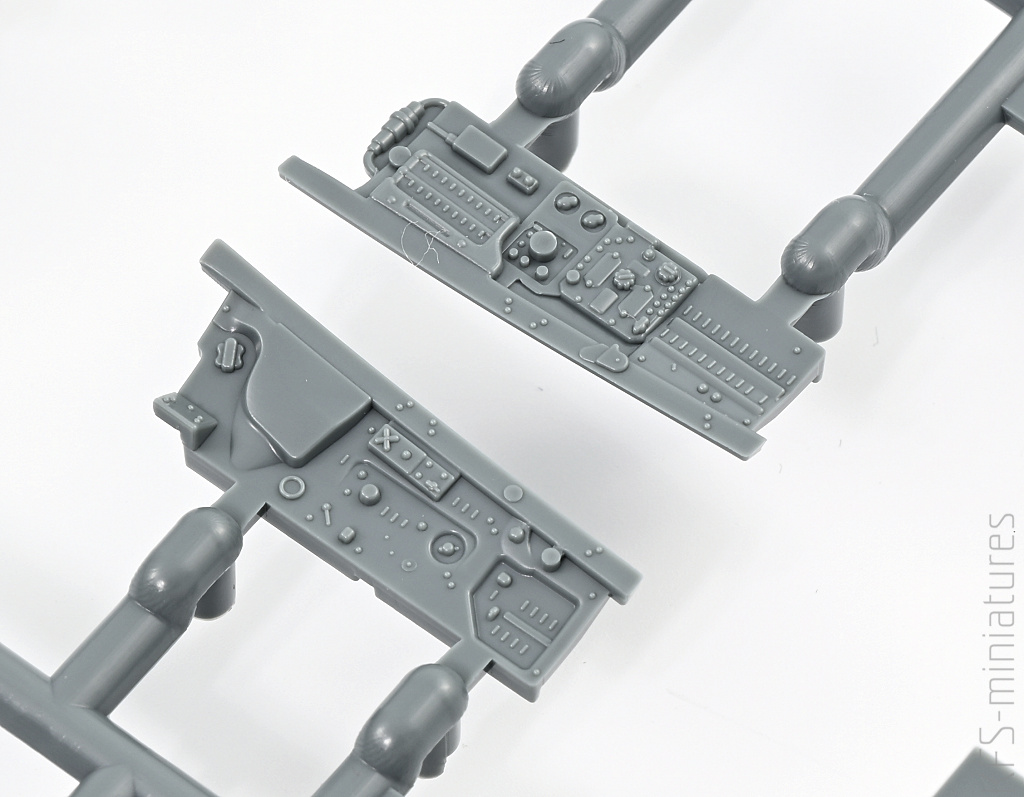 Kokpit wart jest osobnego omówienia. W zestawie dostajemy do wyboru 3 możliwości jego wykonania. Pierwsza to panele odlane z plastiku, ze wszystkimi, dość misternymi przyciskami i przełącznikami. Mamy jednak również ich gołe wersje, na które można nałożyć kalkomanie, tudzież zestawowe blaszki fototrawione. Do wyboru, jak kto chce wykończyć model, zależnie od jego umiejętności.